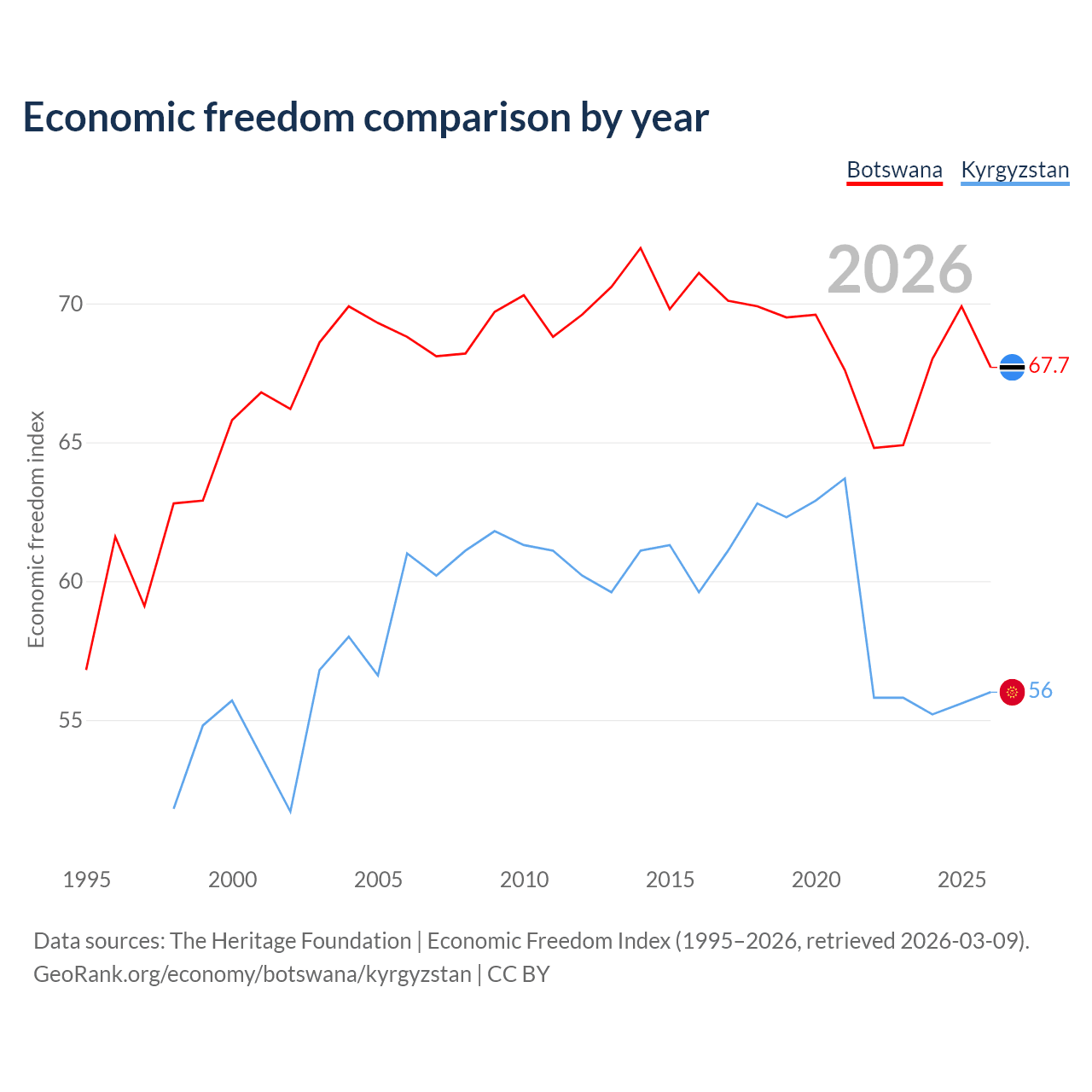 The Economic Freedom Index for Botswana is 67.7, ranking 53/197, compared to 56 for Kyrgyzstan, ranking 126/197. The chart above displays a comparison of annual changes in economic freedom indexes.