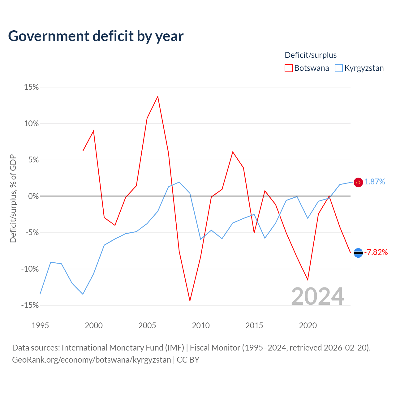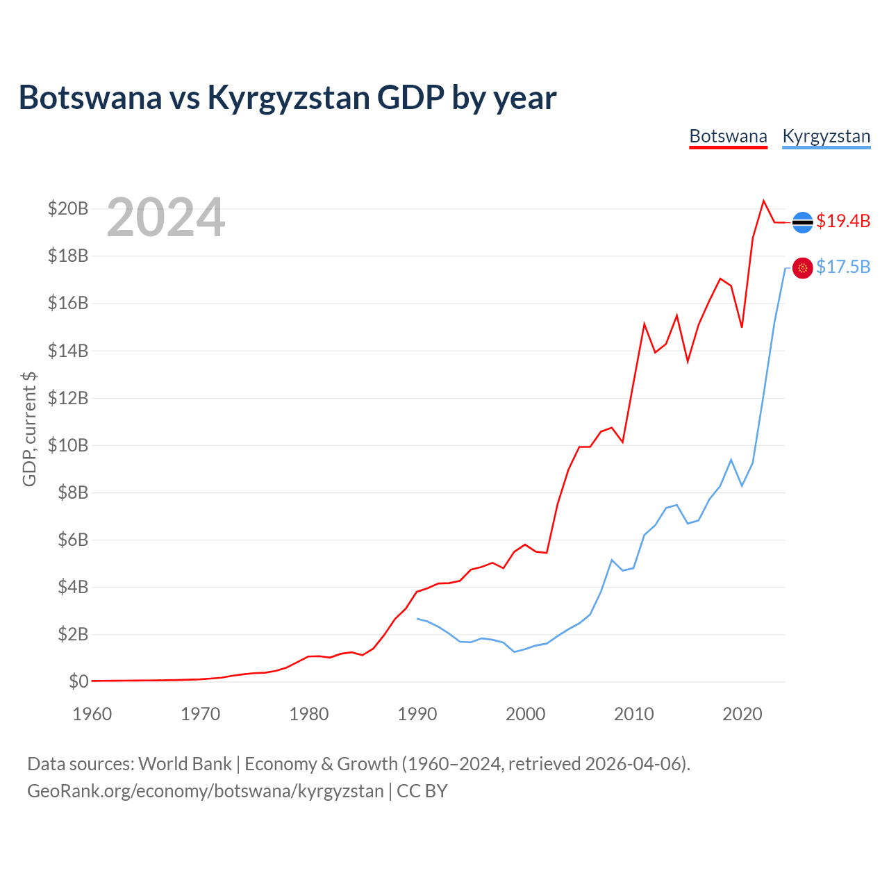 Botswana has a GDP of $19.4B compared to $17.5B for Kyrgyzstan, ranking 133/197 and 135/197 by economy size, respectively.
