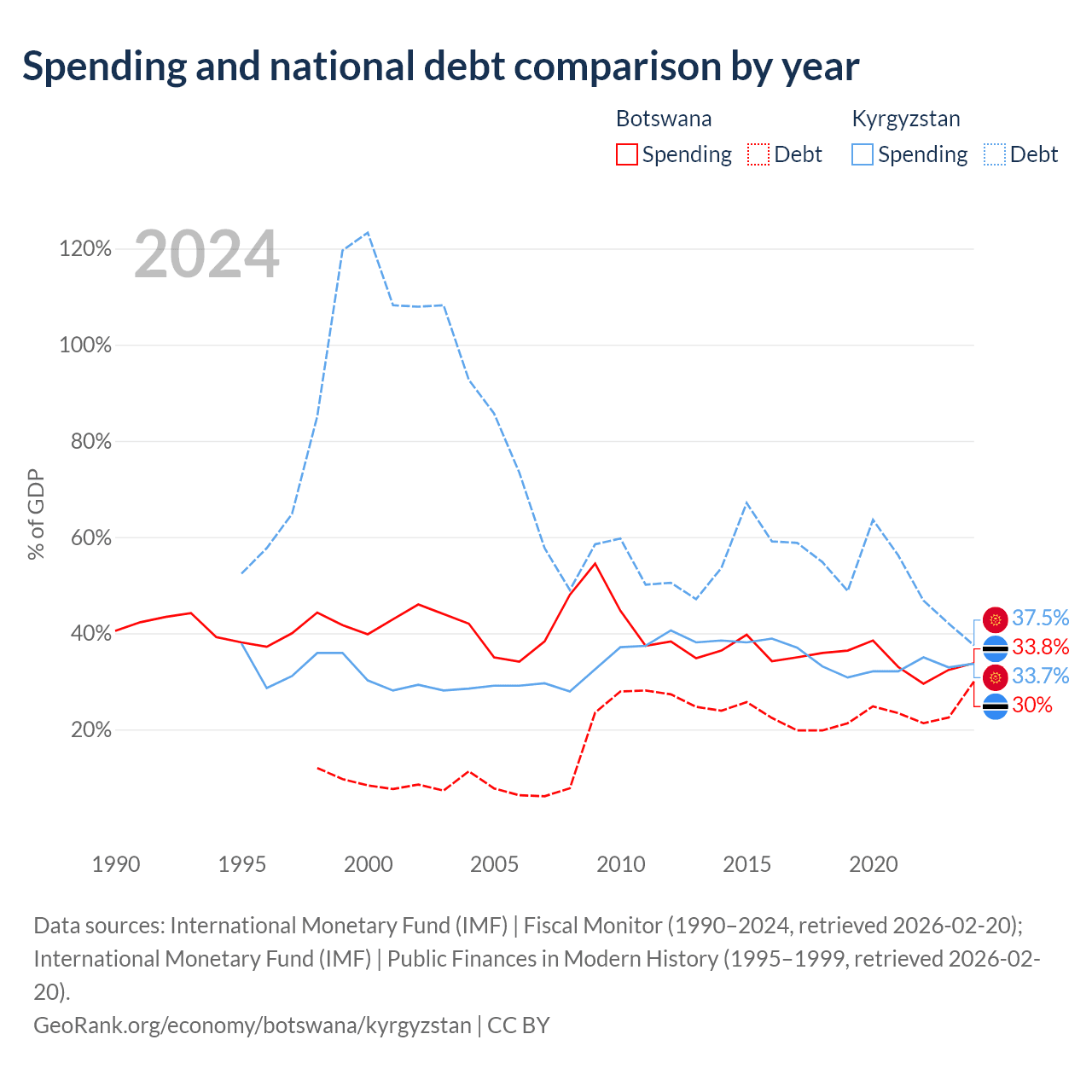 Botswana has $5.82B in government debt (30% of GDP), compared to $6.56B (37.5% of GDP) in Kyrgyzstan.