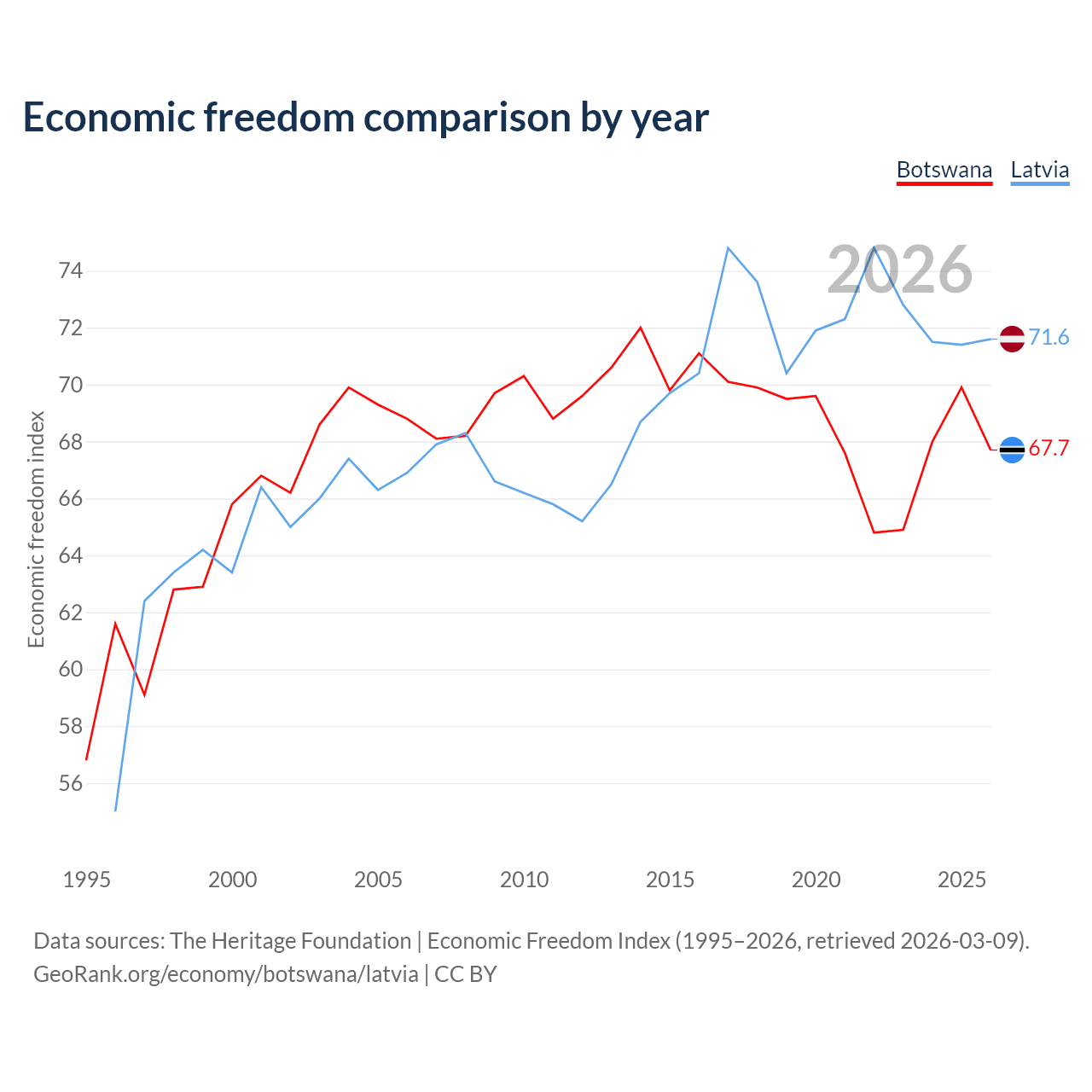 The Economic Freedom Index for Botswana is 67.7, ranking 53/197, compared to 71.6 for Latvia, ranking 31/197. The chart above displays a comparison of annual changes in economic freedom indexes.
