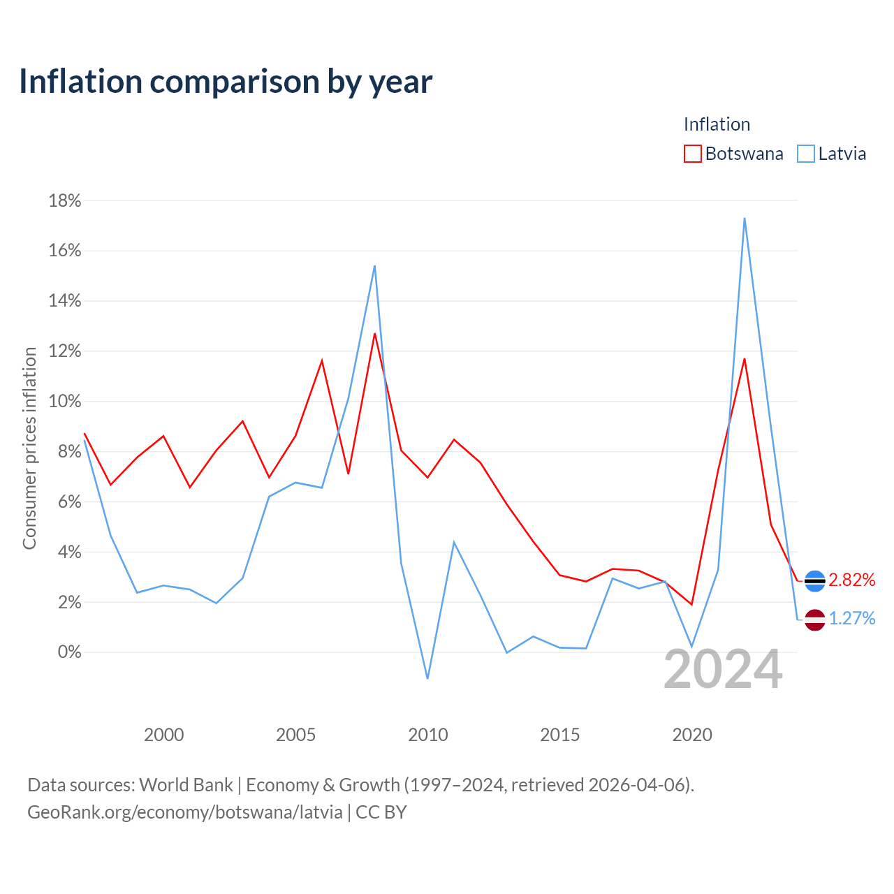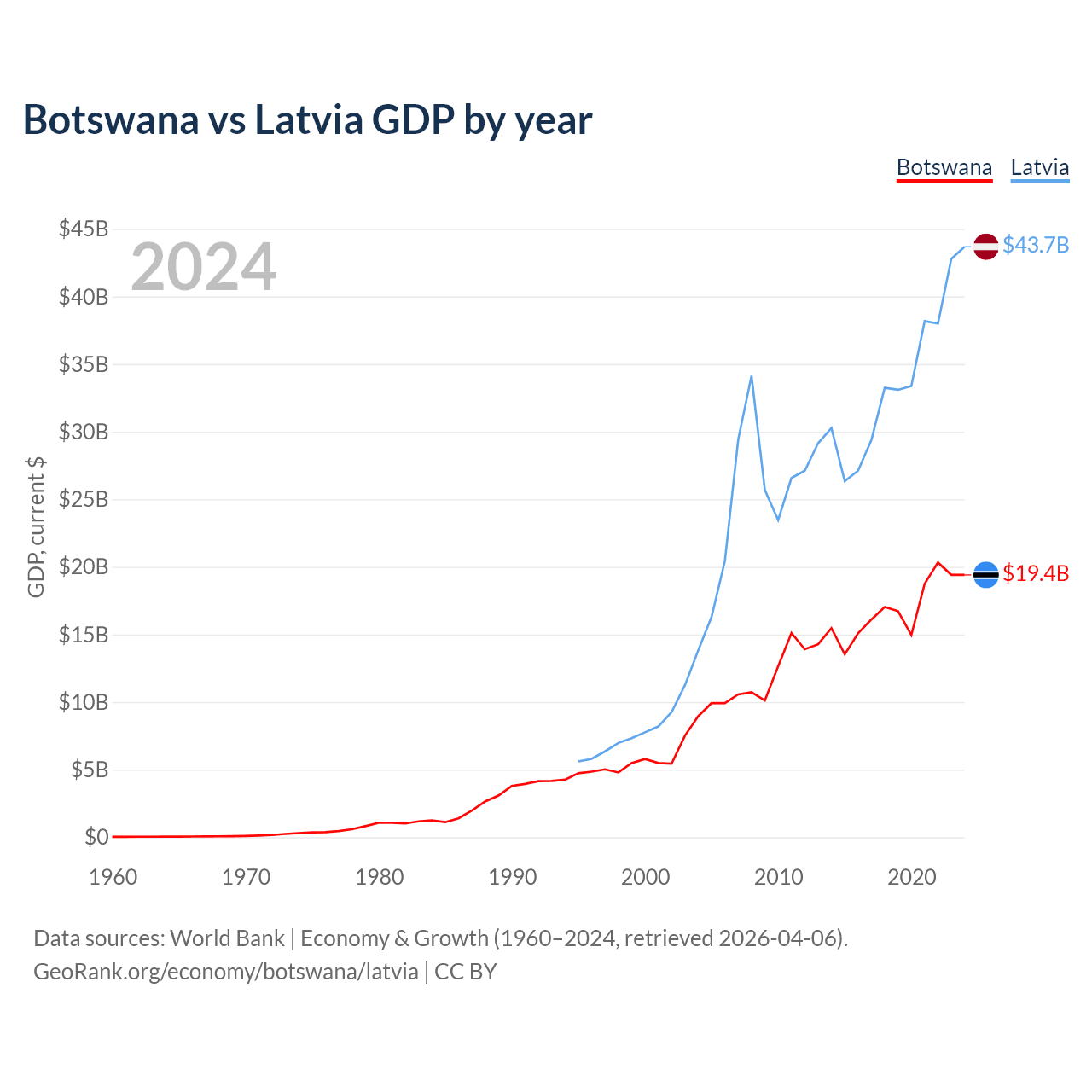 Botswana has a GDP of $19.4B compared to $43.7B for Latvia, ranking 133/197 and 99/197 by economy size, respectively.