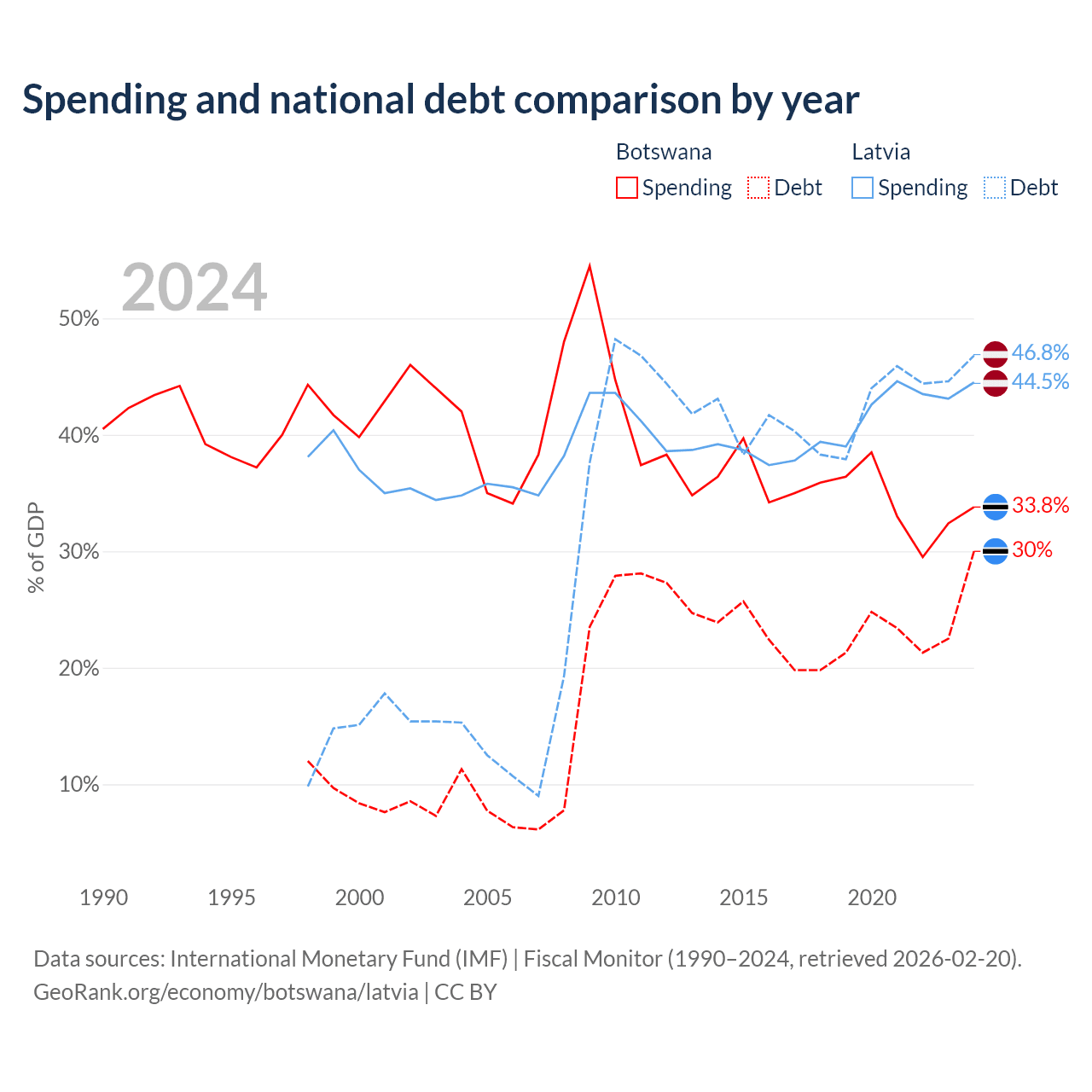 Botswana has $5.82B in government debt (30% of GDP), compared to $20.4B (46.8% of GDP) in Latvia.