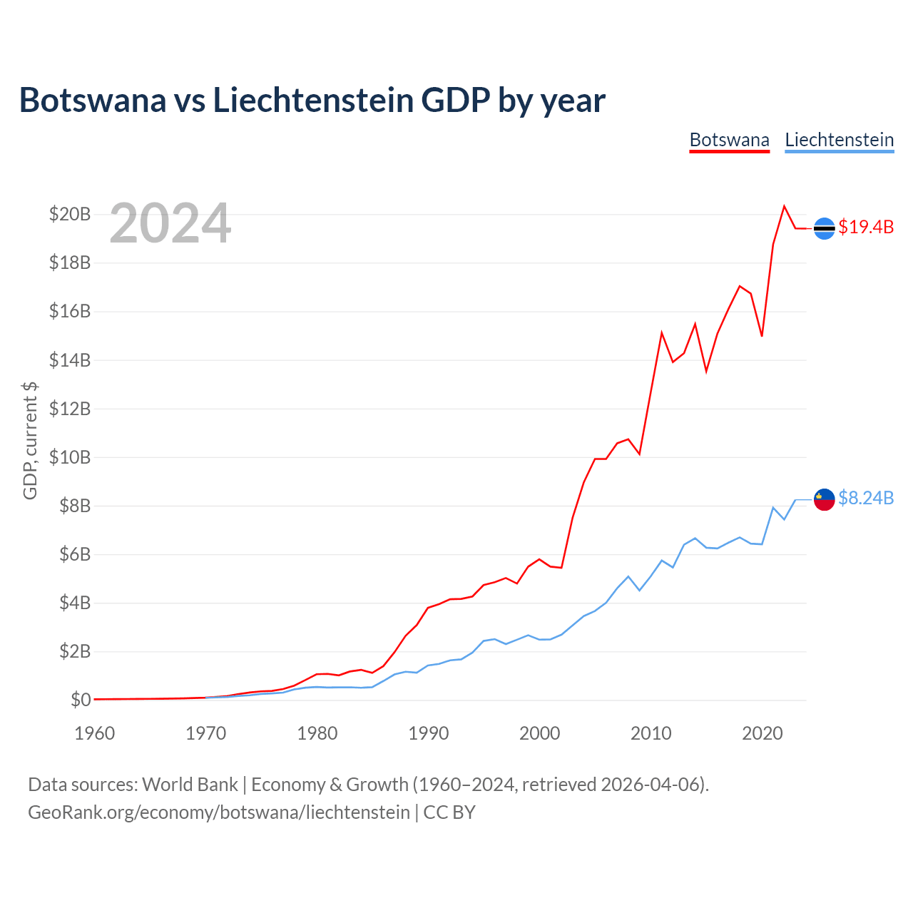 Botswana has a GDP of $19.4B compared to $8.24B for Liechtenstein, ranking 133/197 and 156/197 by economy size, respectively.