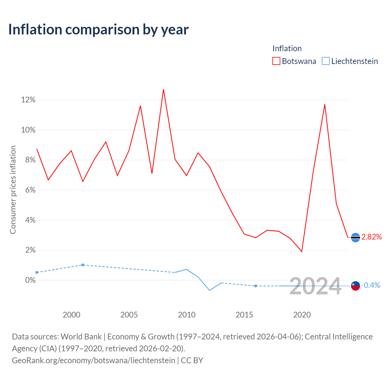 Over the past 24 years, Botswana has recorded an average annual inflation rate of 6.7%, compared with 0.04% in Liechtenstein. In 2020, inflation was 2.82% in Botswana and -0.4% in Liechtenstein.
