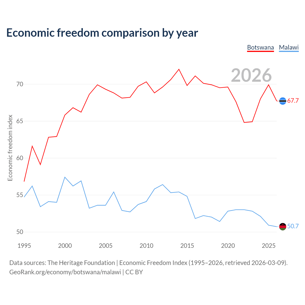 The Economic Freedom Index for Botswana is 67.7, ranking 53/197, compared to 50.7 for Malawi, ranking 159/197. The chart above displays a comparison of annual changes in economic freedom indexes.