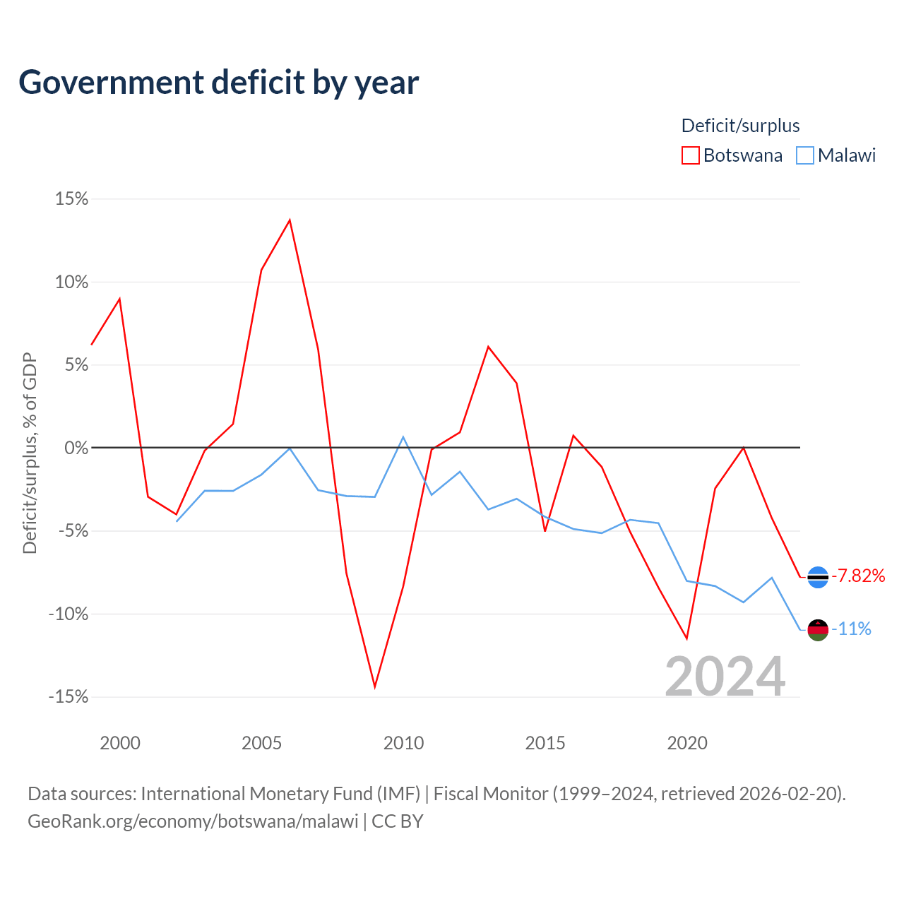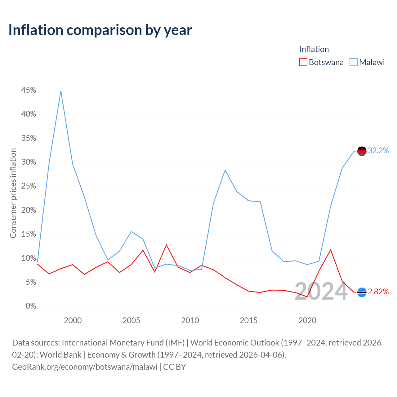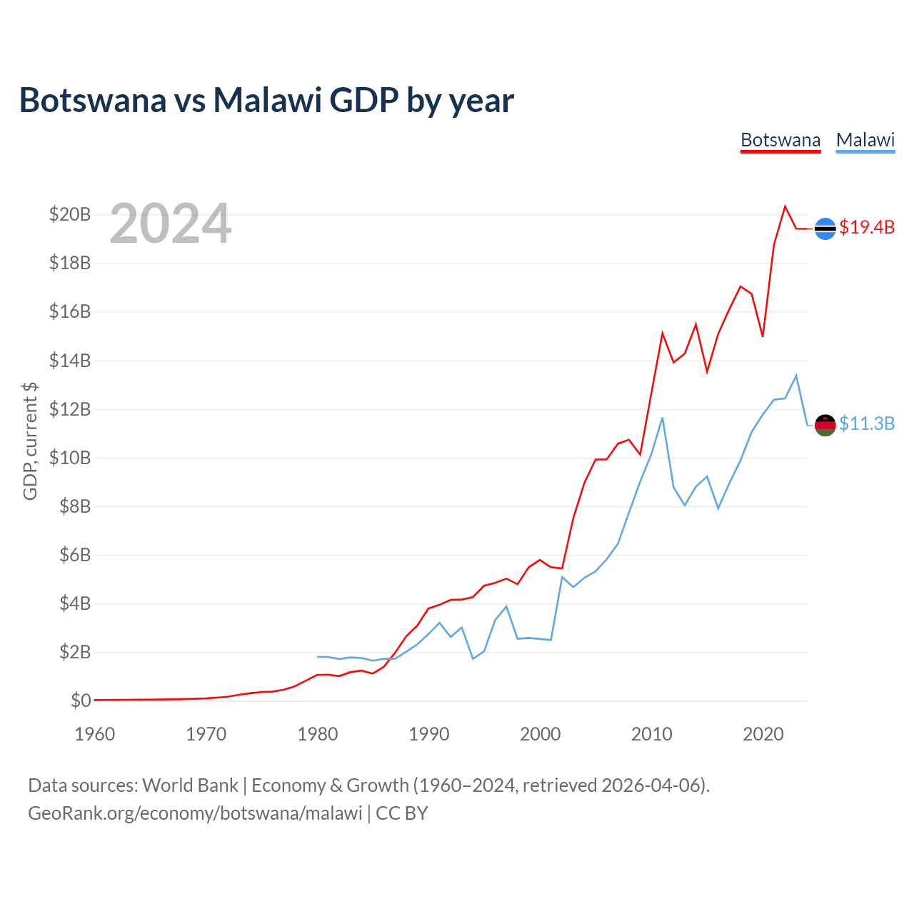 Botswana has a GDP of $19.4B compared to $11.3B for Malawi, ranking 133/197 and 151/197 by economy size, respectively.