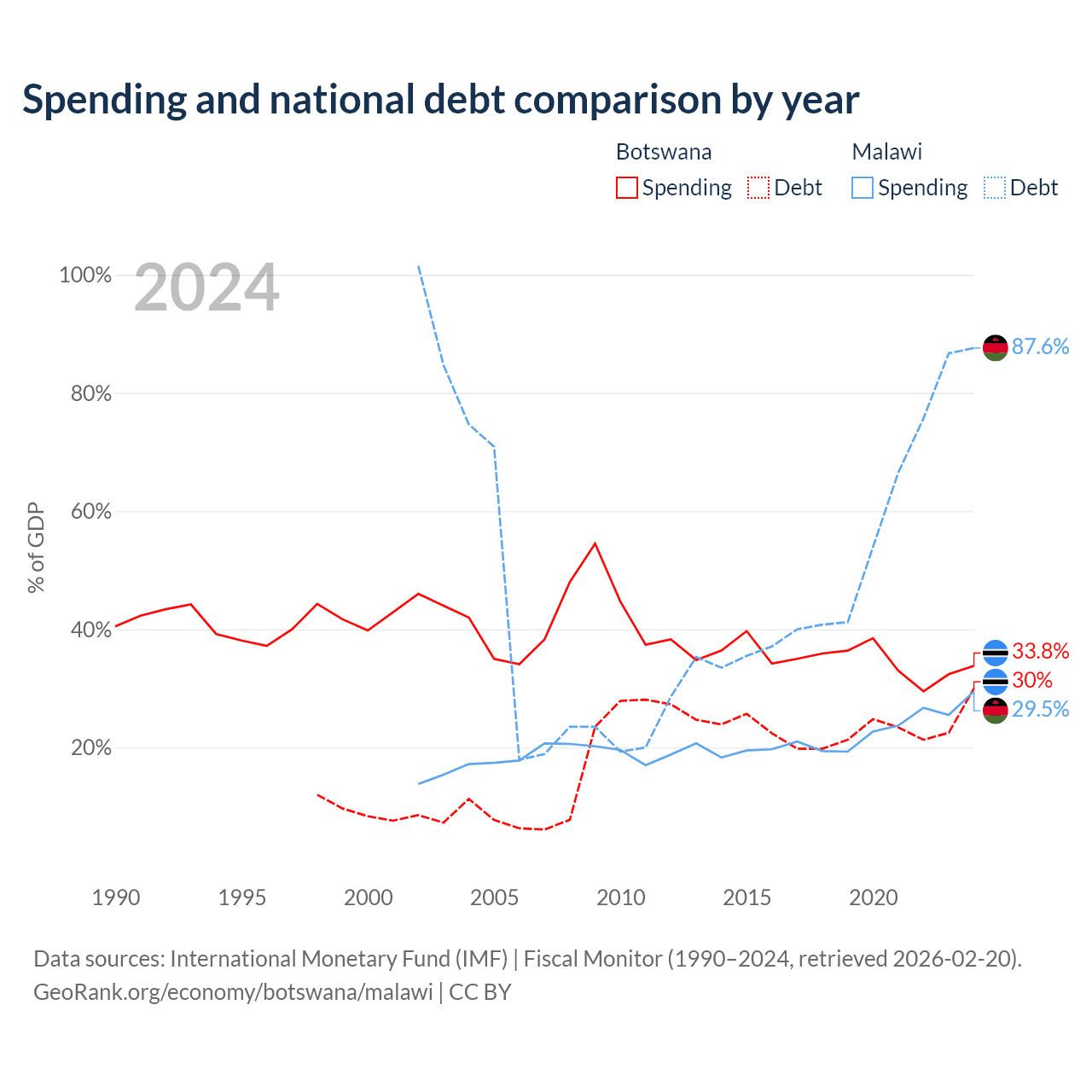 Botswana has $5.82B in government debt (30% of GDP), compared to $9.91B (87.6% of GDP) in Malawi.