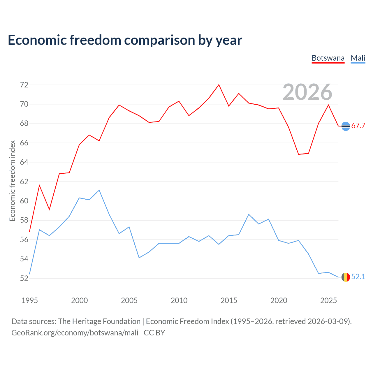 The Economic Freedom Index for Botswana is 67.7, ranking 53/197, compared to 52.1 for Mali, ranking 150/197. The chart above displays a comparison of annual changes in economic freedom indexes.