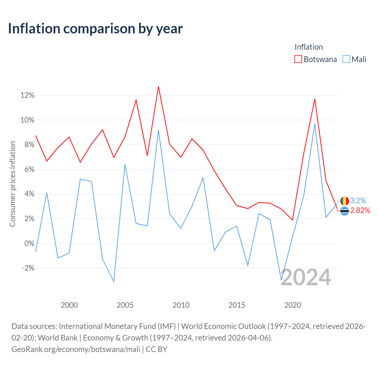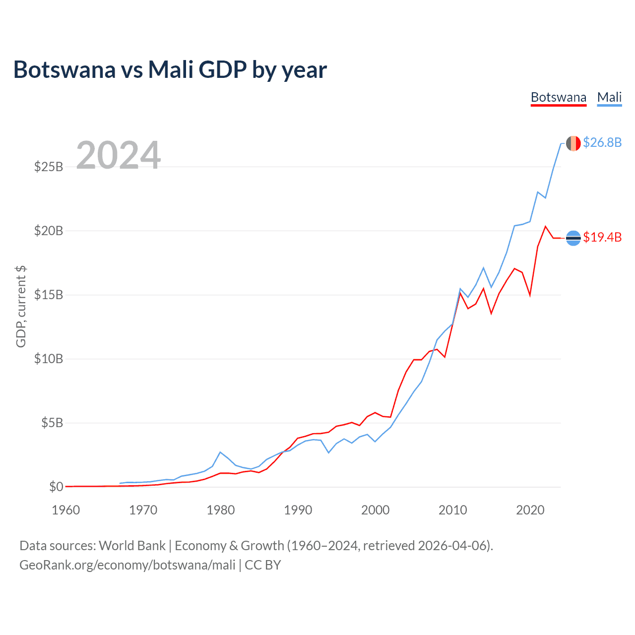 Botswana has a GDP of $19.4B compared to $26.8B for Mali, ranking 133/197 and 113/197 by economy size, respectively.