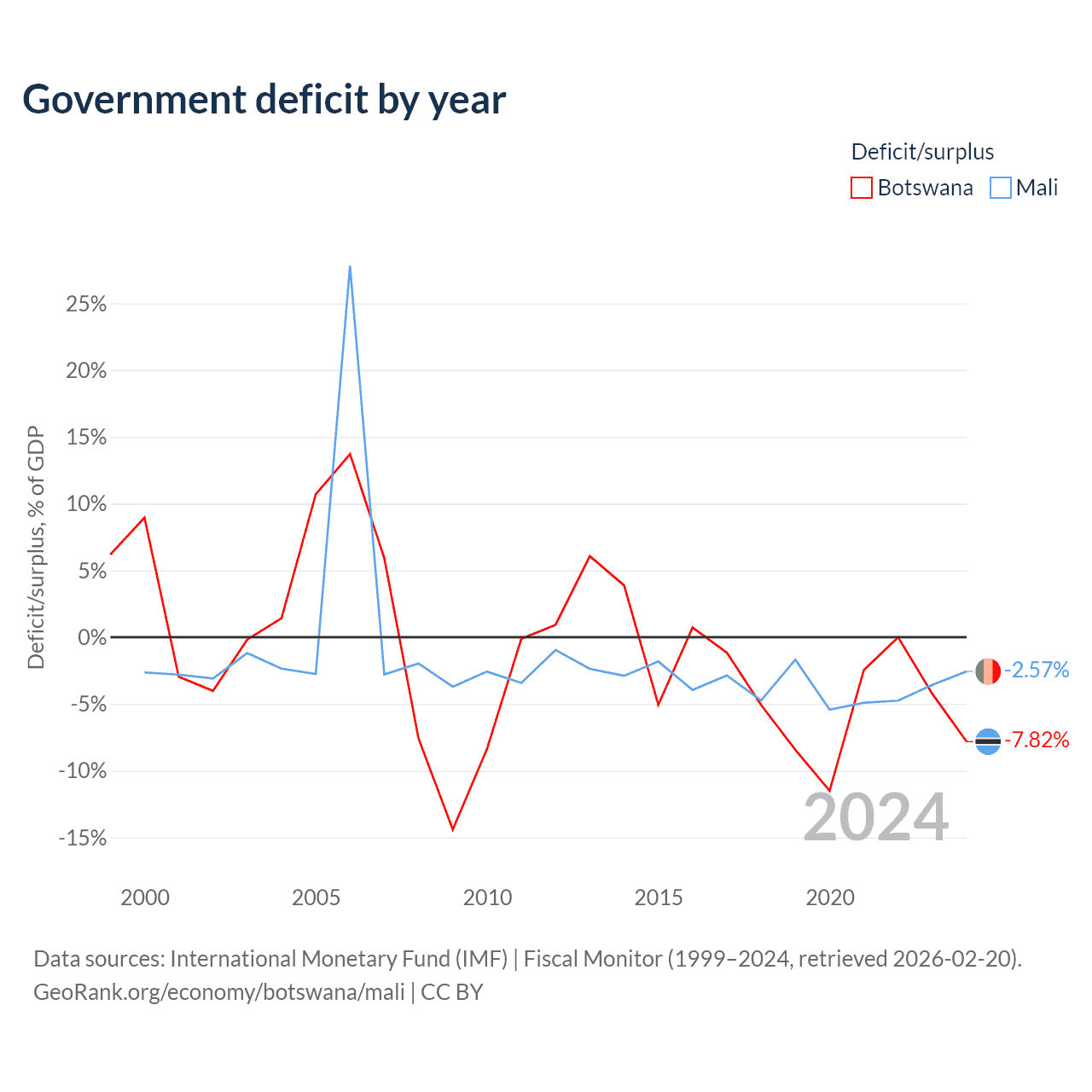 Botswana has $5.82B in government debt (30% of GDP), compared to $13.9B (51.7% of GDP) in Mali.