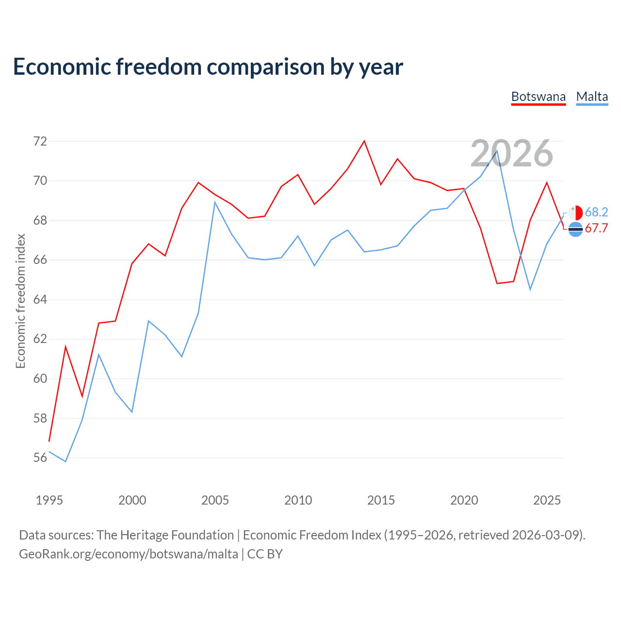 The Economic Freedom Index for Botswana is 67.7, ranking 53/197, compared to 68.2 for Malta, ranking 49/197. The chart above displays a comparison of annual changes in economic freedom indexes.