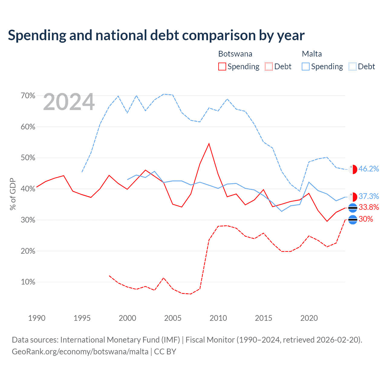 Botswana has $5.82B in government debt (30% of GDP), compared to $11.5B (46.2% of GDP) in Malta.