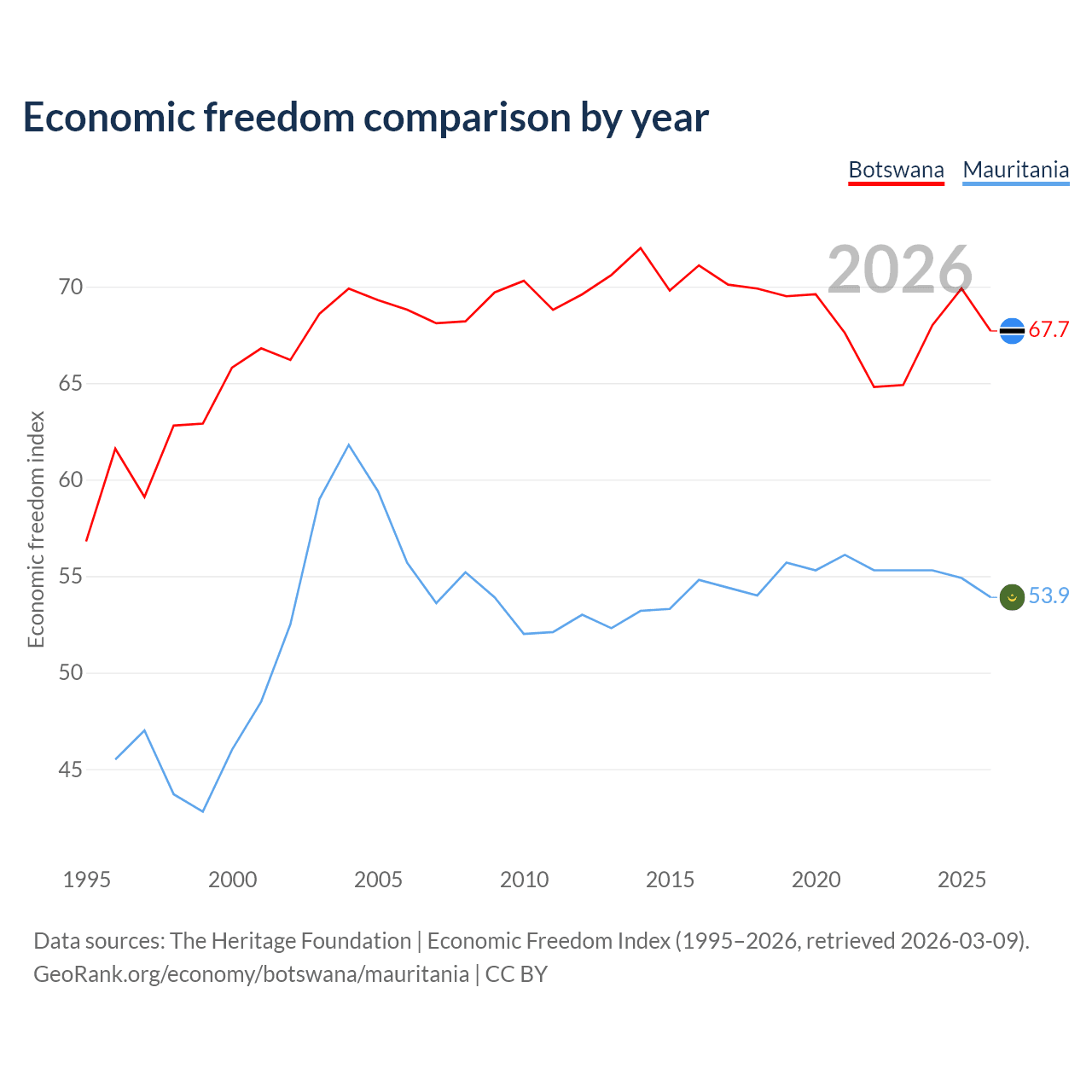 The Economic Freedom Index for Botswana is 67.7, ranking 53/197, compared to 53.9 for Mauritania, ranking 136/197. The chart above displays a comparison of annual changes in economic freedom indexes.