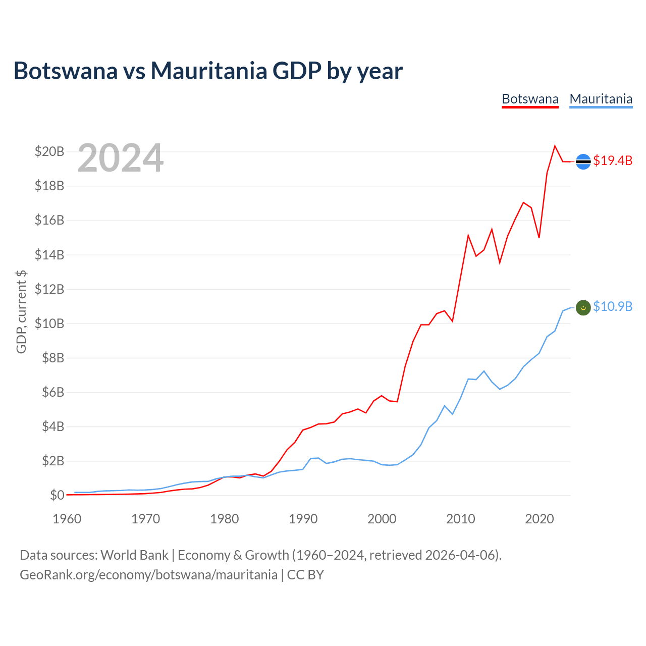Botswana has a GDP of $19.4B compared to $10.9B for Mauritania, ranking 133/197 and 153/197 by economy size, respectively.