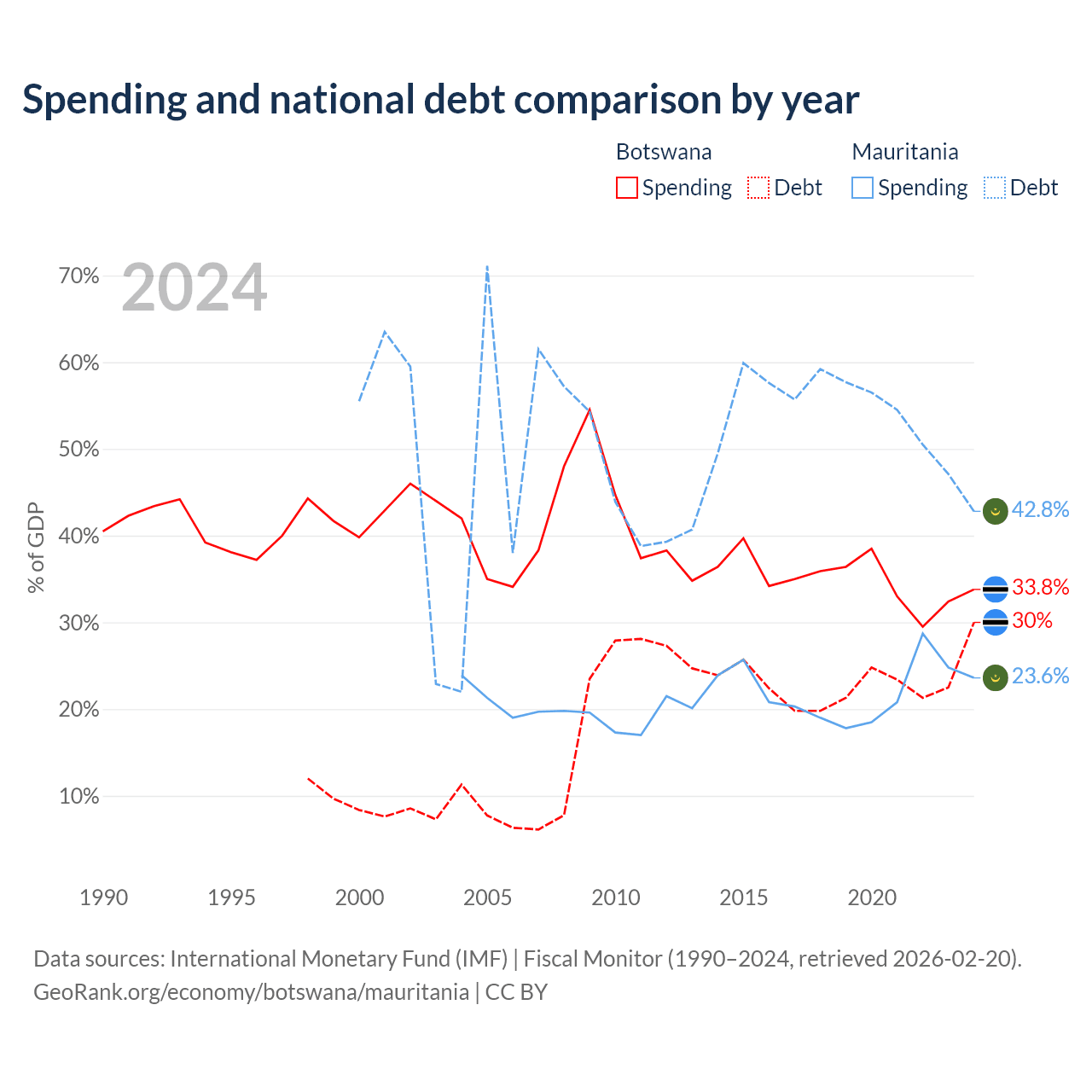 Botswana has $5.82B in government debt (30% of GDP), compared to $4.67B (42.8% of GDP) in Mauritania.