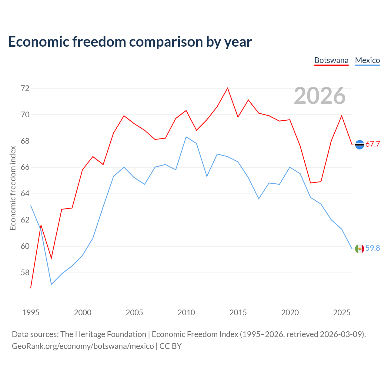 The Economic Freedom Index for Botswana is 67.7, ranking 53/197, compared to 59.8 for Mexico, ranking 102/197. The chart above displays a comparison of annual changes in economic freedom indexes.