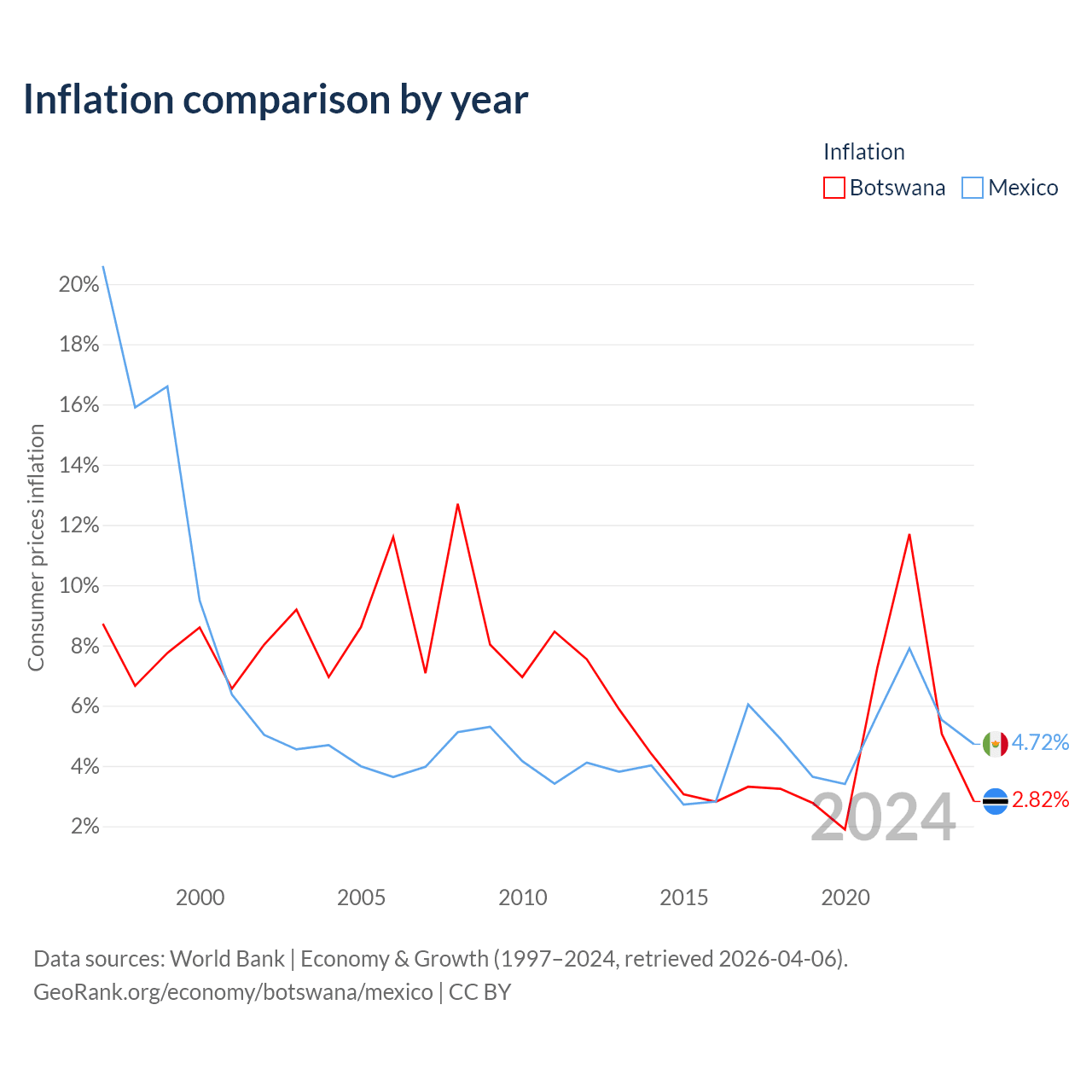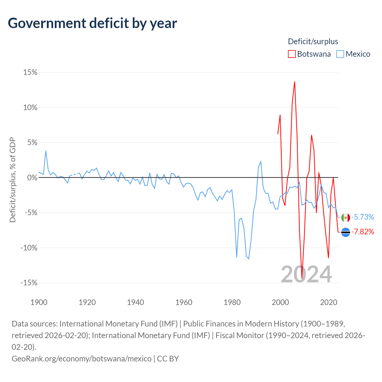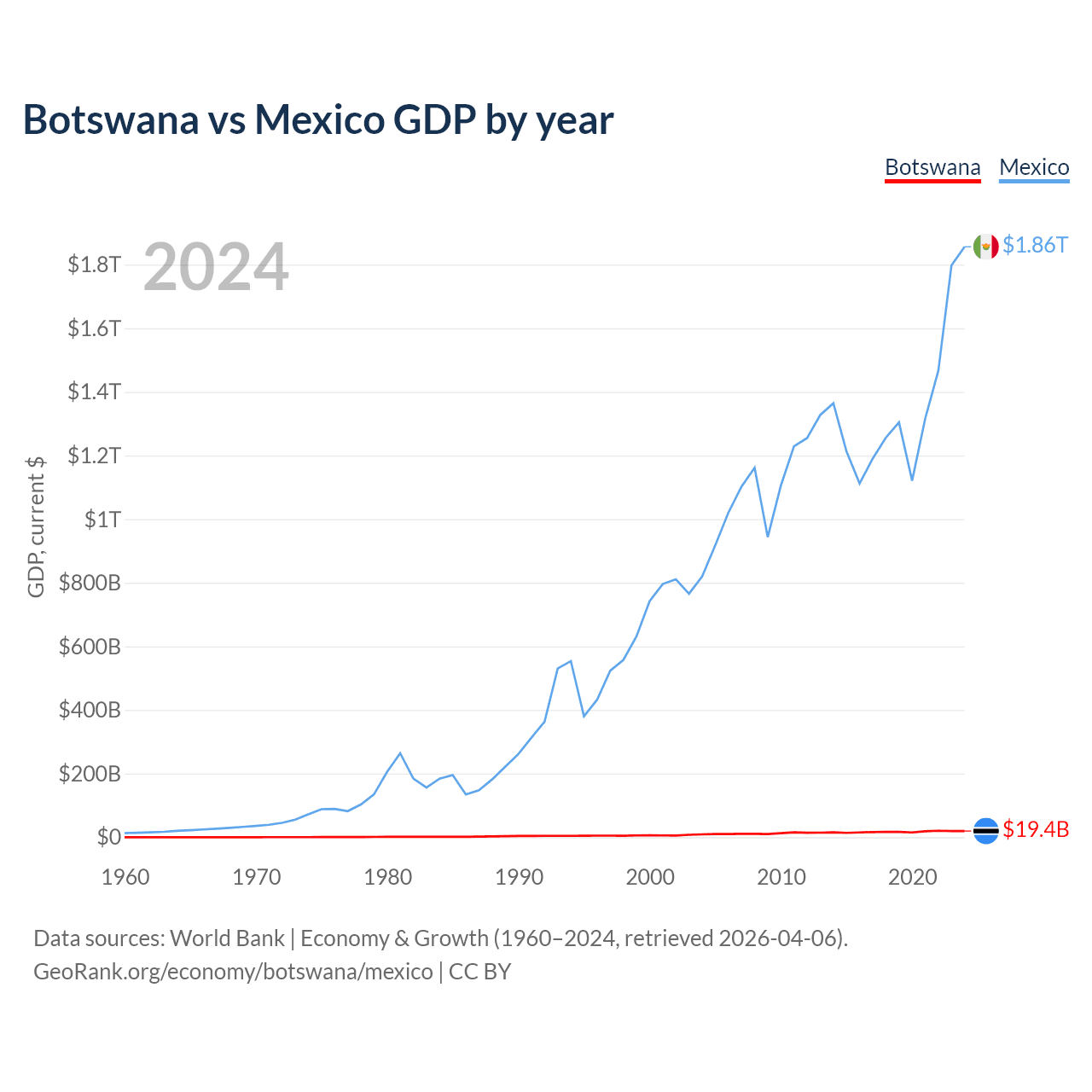 Botswana has a GDP of $19.4B compared to $1.86T for Mexico, ranking 133/197 and 13/197 by economy size, respectively.