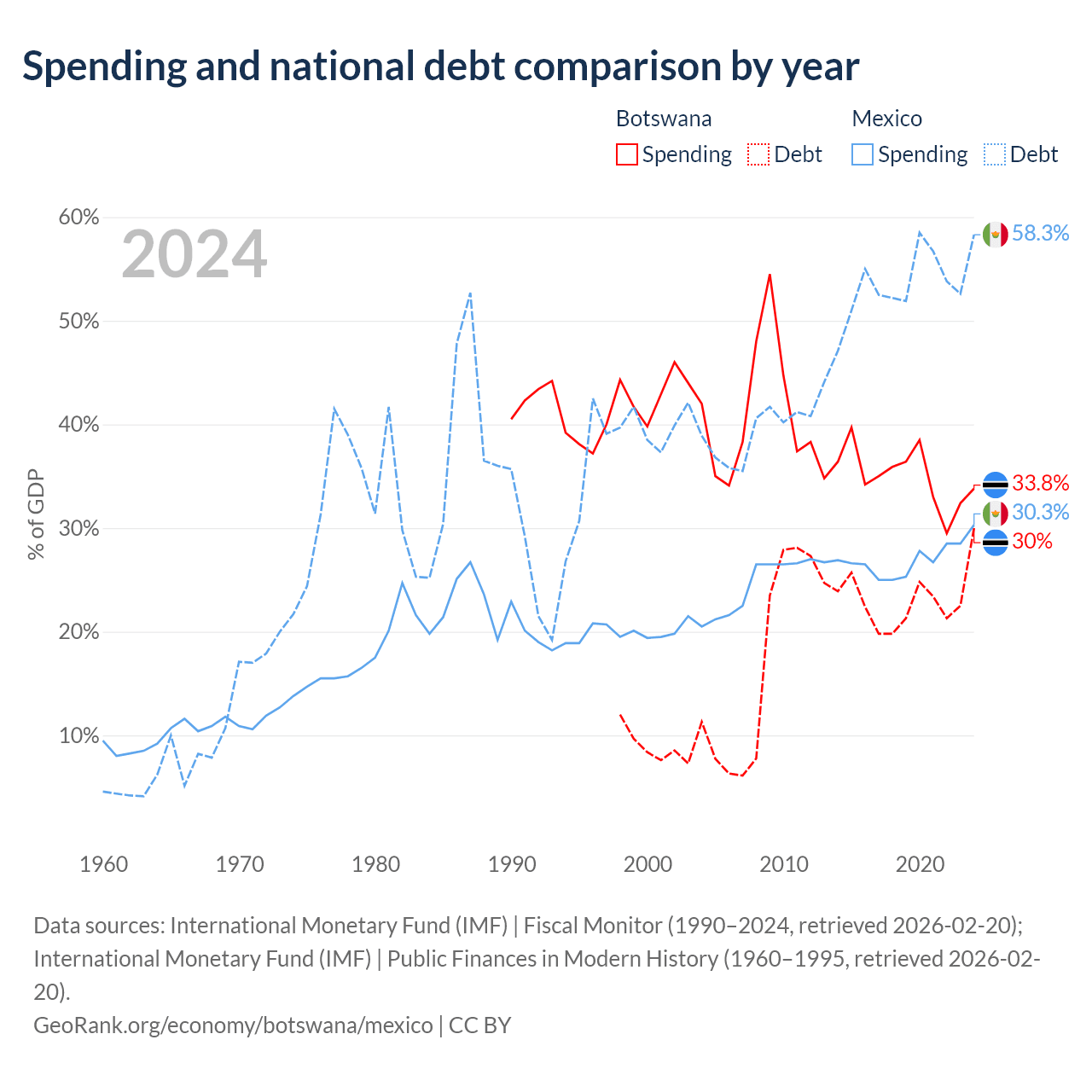 Botswana has $5.82B in government debt (30% of GDP), compared to $1.08T (58.3% of GDP) in Mexico.