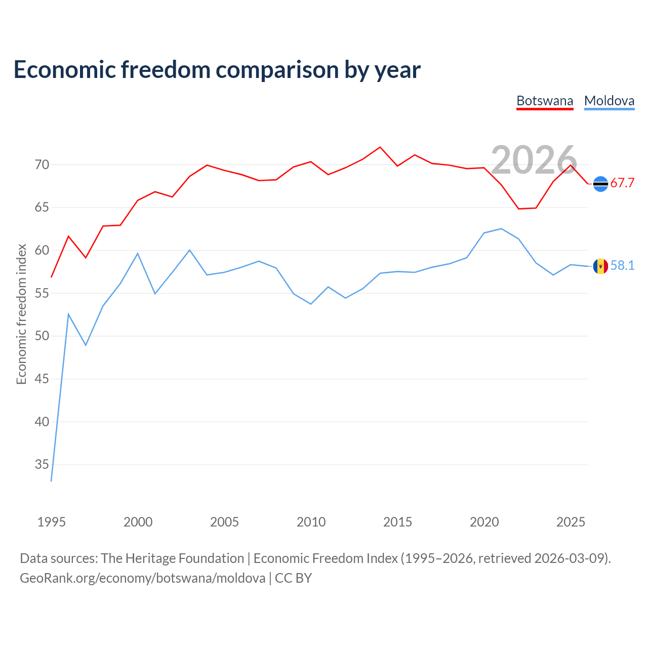The Economic Freedom Index for Botswana is 67.7, ranking 53/197, compared to 58.1 for Moldova, ranking 112/197. The chart above displays a comparison of annual changes in economic freedom indexes.