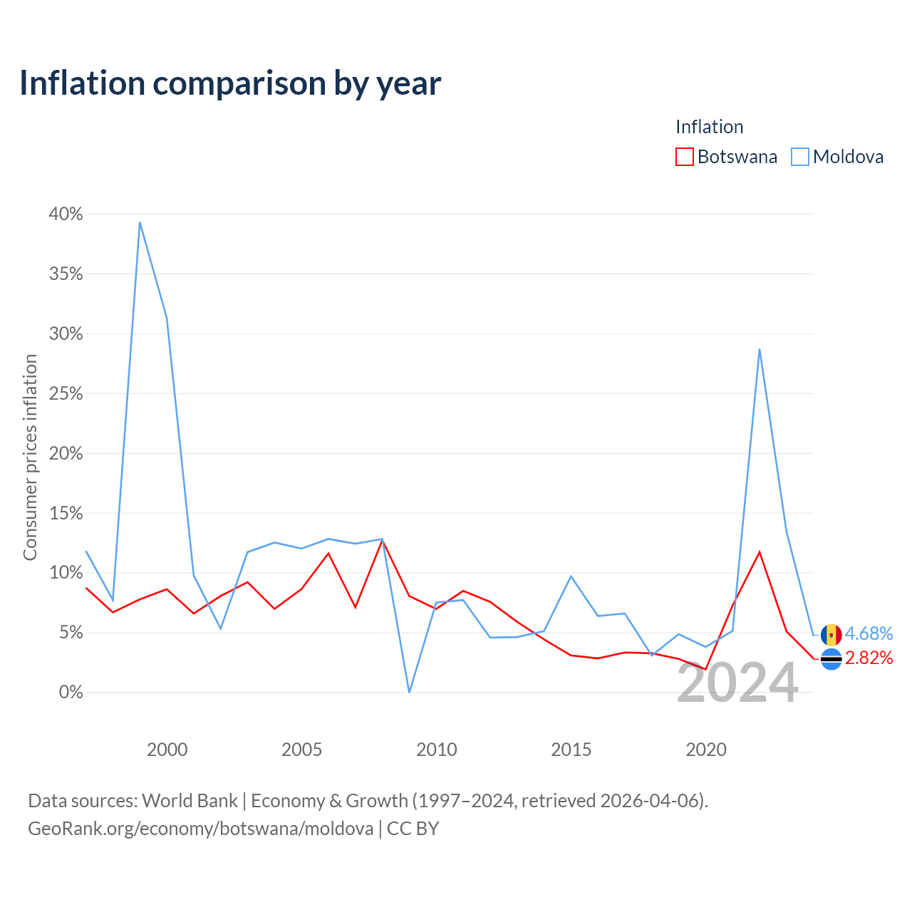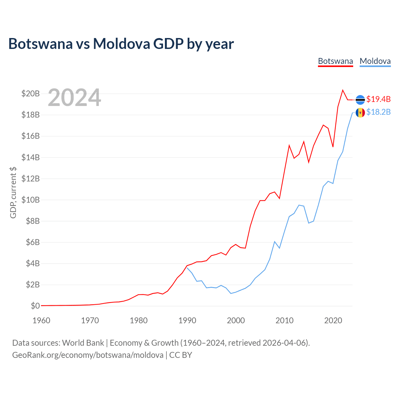 Botswana has a GDP of $19.4B compared to $18.2B for Moldova, ranking 133/197 and 134/197 by economy size, respectively.