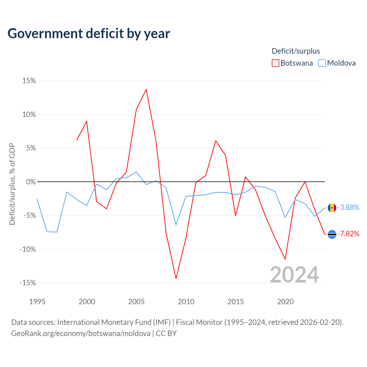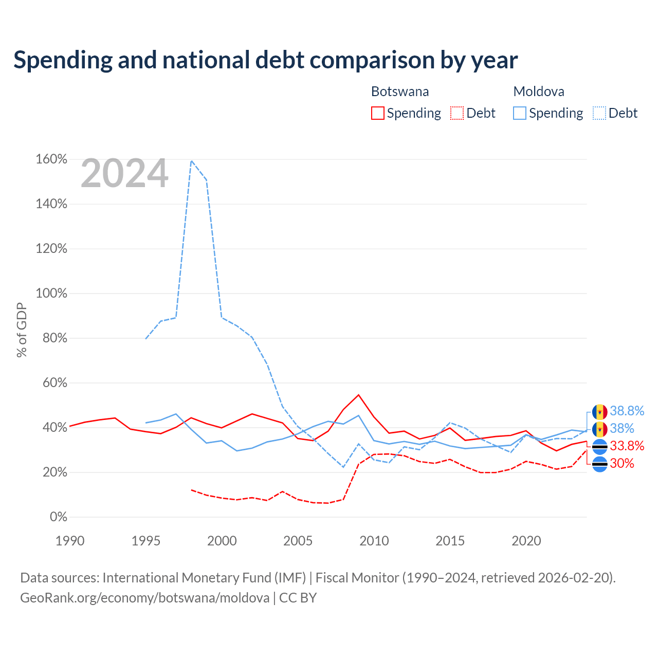 Botswana has $5.82B in government debt (30% of GDP), compared to $7.06B (38.8% of GDP) in Moldova.