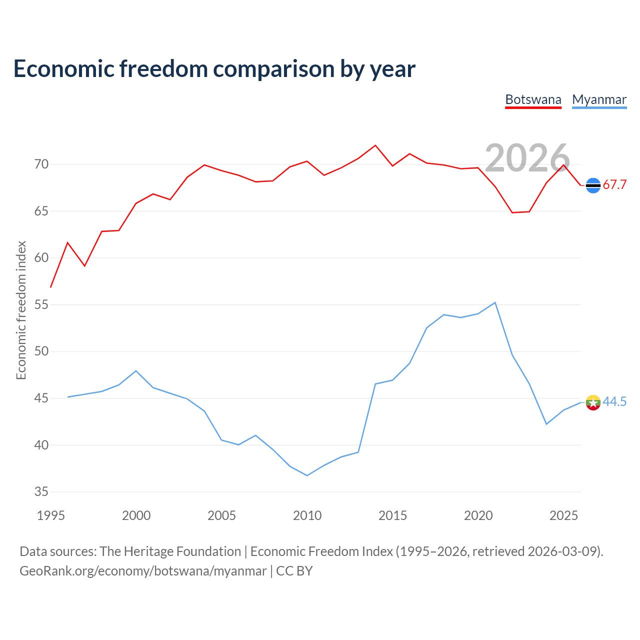 The Economic Freedom Index for Botswana is 67.7, ranking 53/197, compared to 44.5 for Myanmar, ranking 180/197. The chart above displays a comparison of annual changes in economic freedom indexes.