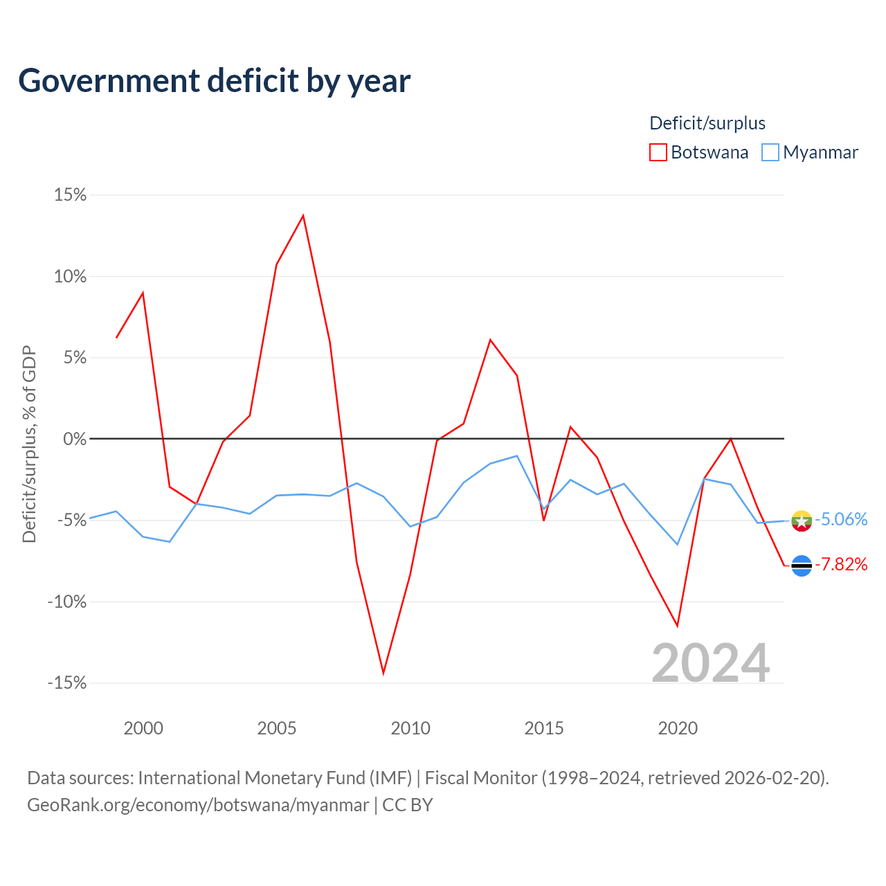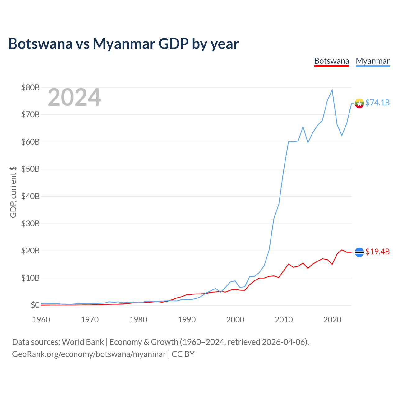 Botswana has a GDP of $19.4B compared to $74.1B for Myanmar, ranking 133/197 and 85/197 by economy size, respectively.