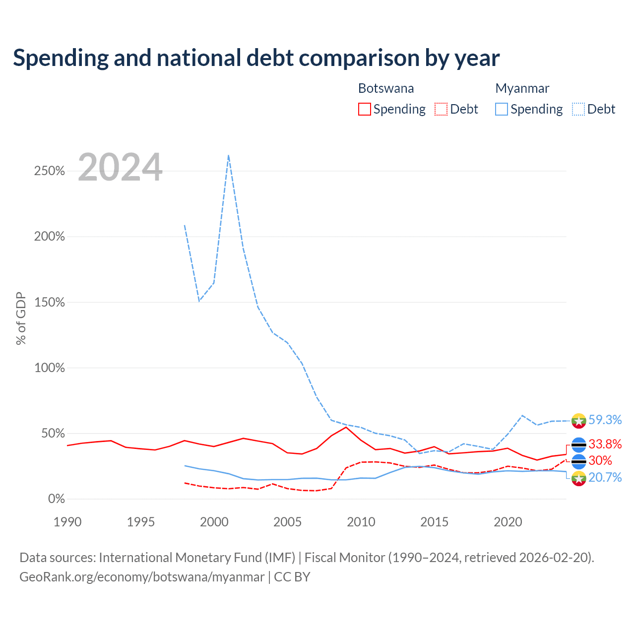 Botswana has $5.82B in government debt (30% of GDP), compared to $44B (59.3% of GDP) in Myanmar.
