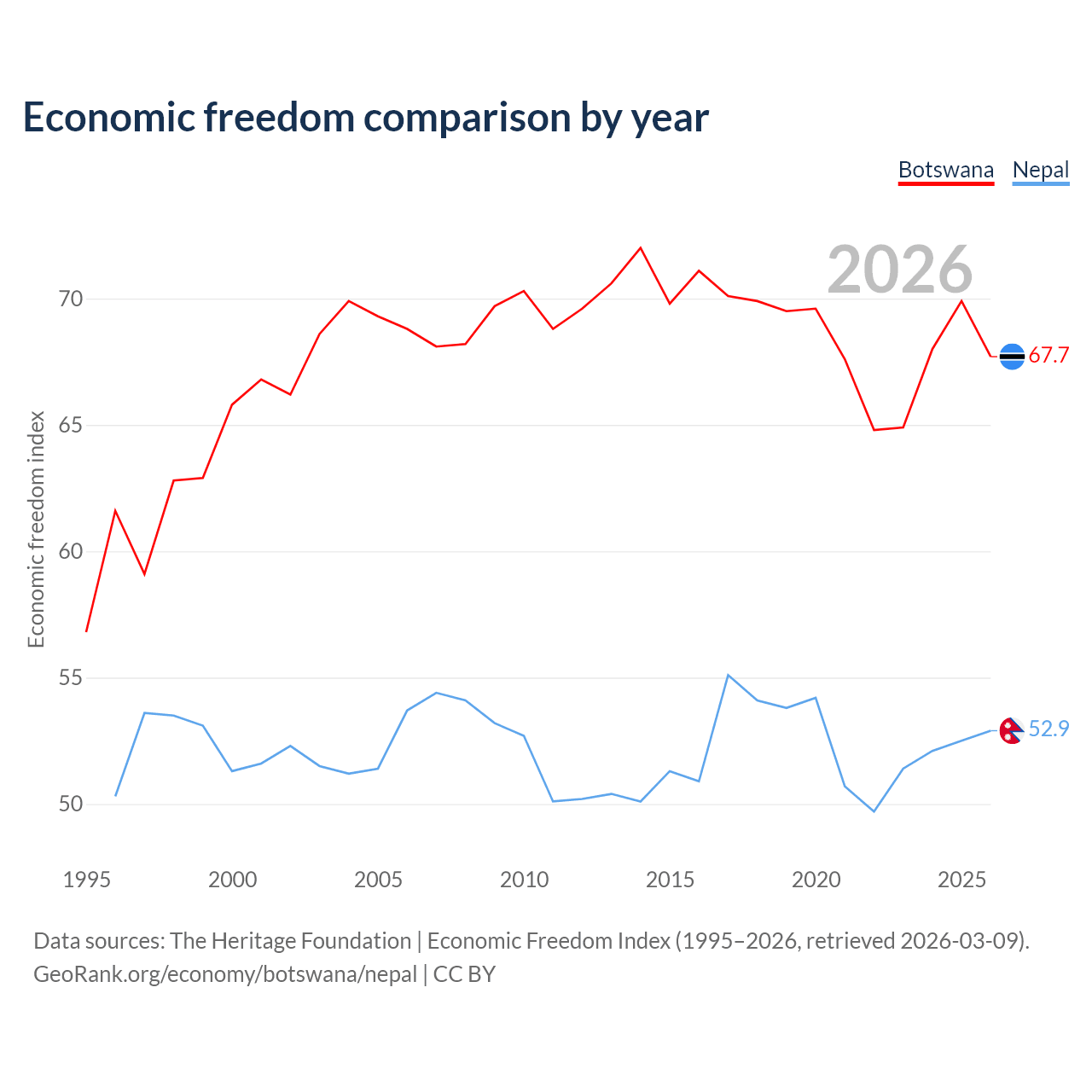 The Economic Freedom Index for Botswana is 67.7, ranking 53/197, compared to 52.9 for Nepal, ranking 144/197. The chart above displays a comparison of annual changes in economic freedom indexes.