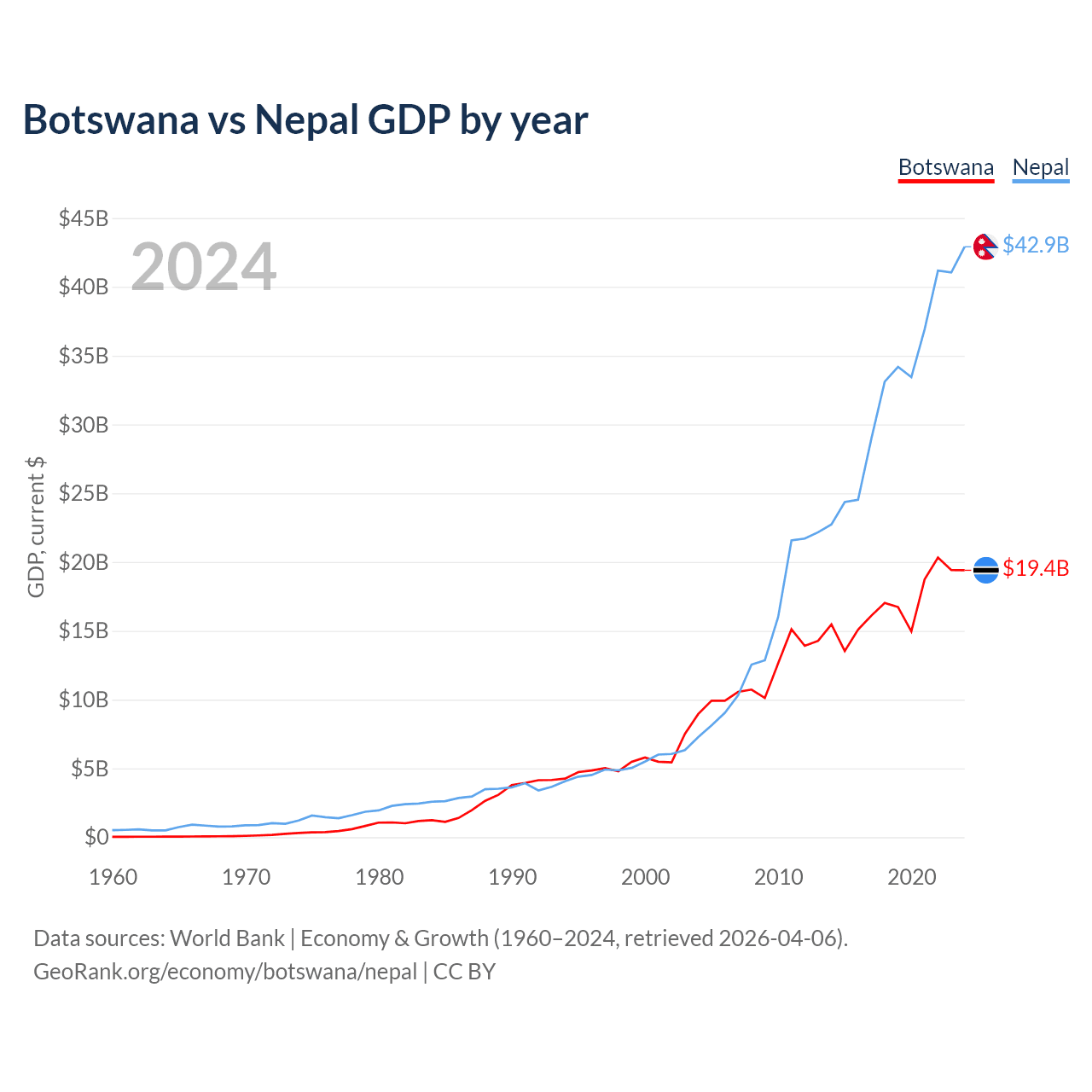 Botswana vs Nepal GDP by year