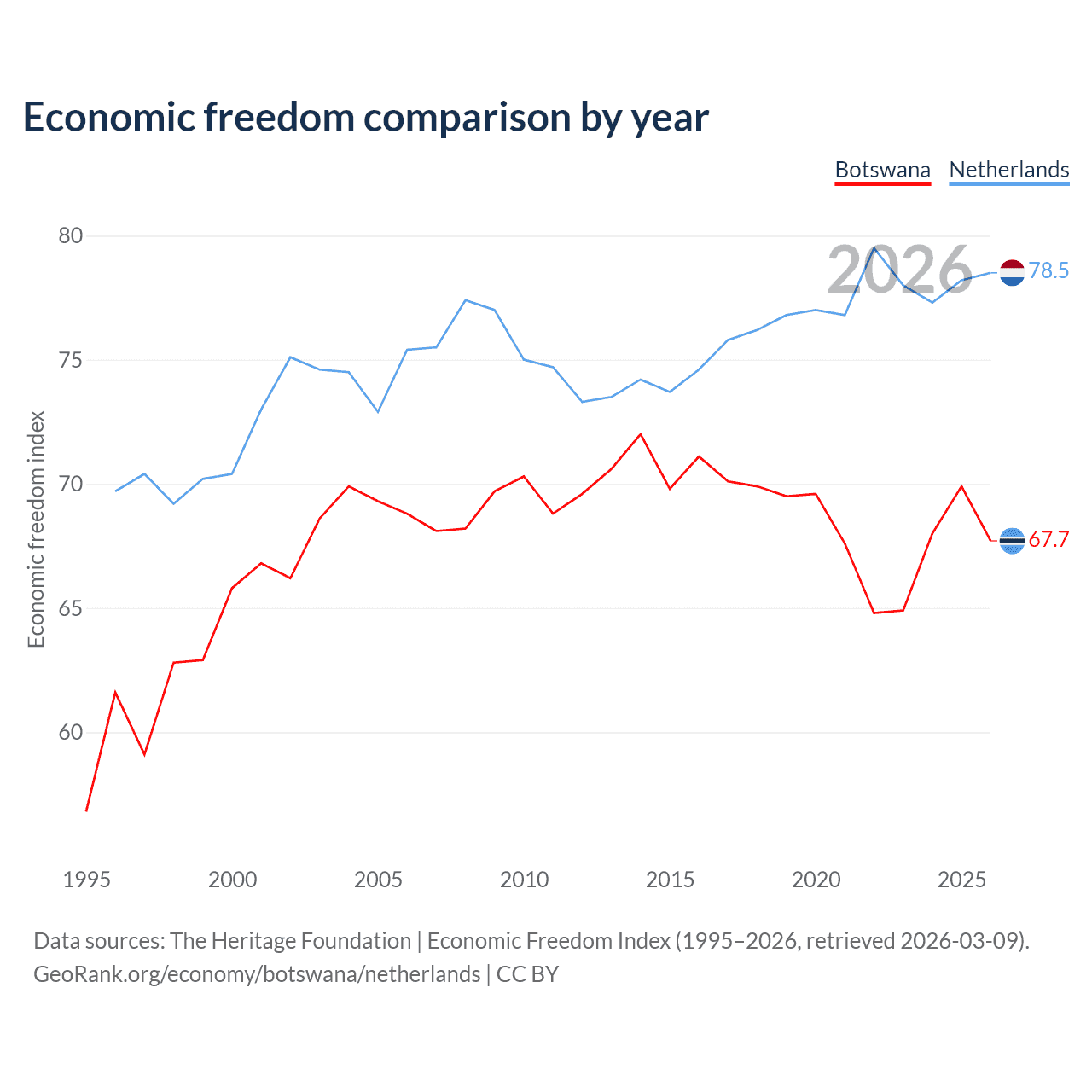 The Economic Freedom Index for Botswana is 67.7, ranking 53/197, compared to 78.5 for the Netherlands, ranking 11/197. The chart above displays a comparison of annual changes in economic freedom indexes.