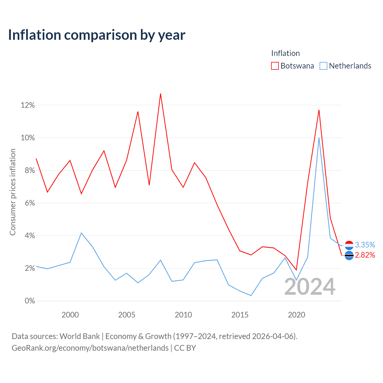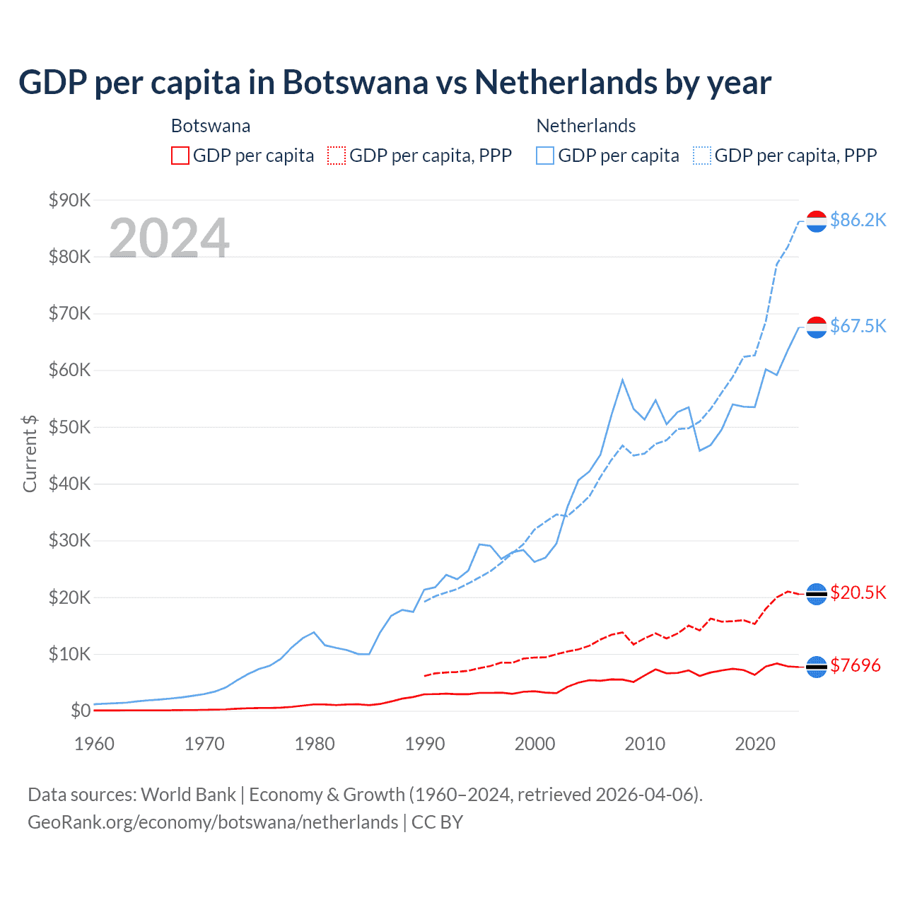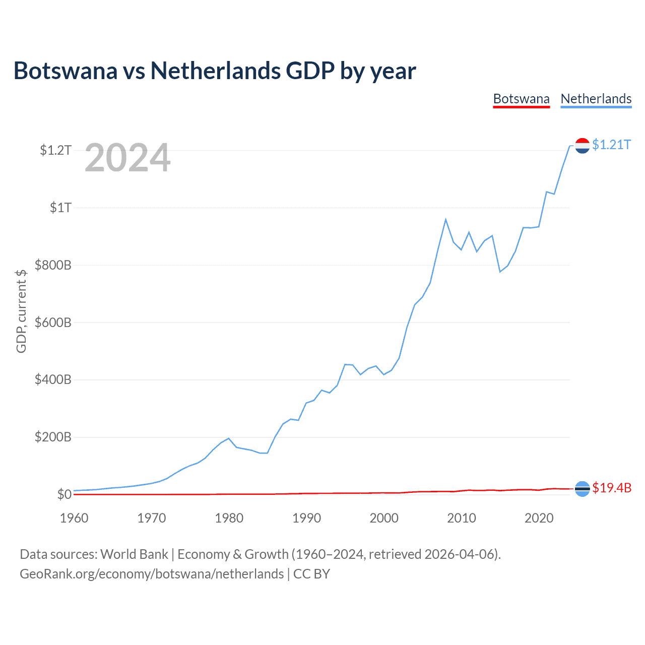 Botswana has a GDP of $19.4B compared to $1.21T for the Netherlands, ranking 133/197 and 19/197 by economy size, respectively.