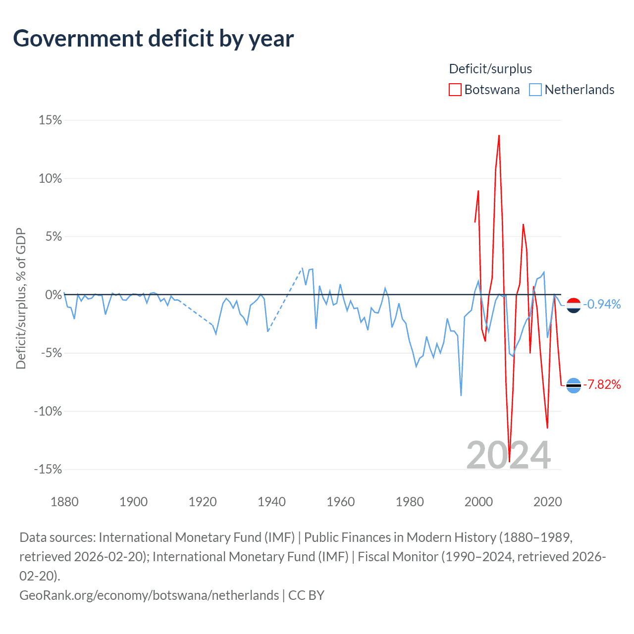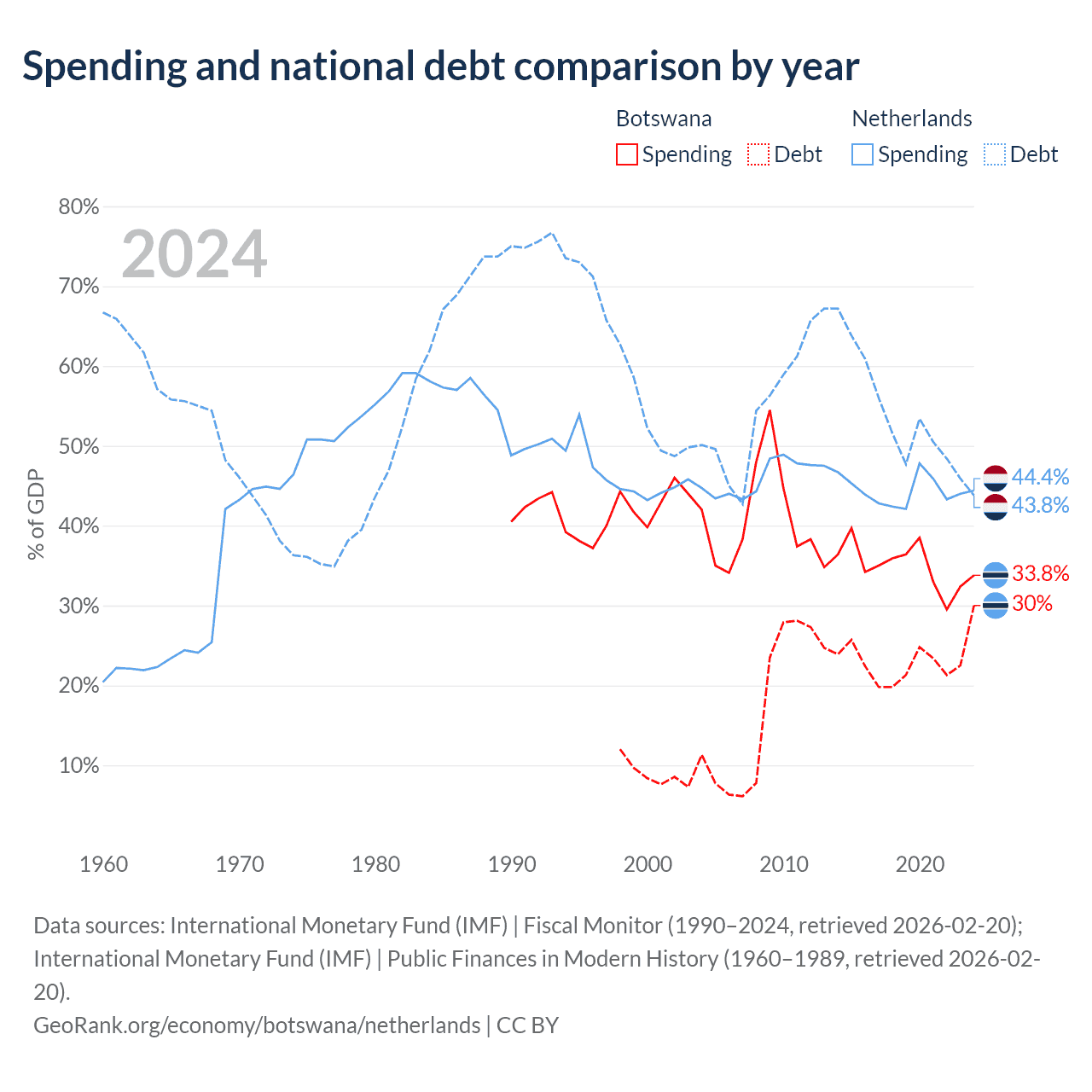 Botswana has $5.82B in government debt (30% of GDP), compared to $532B (43.8% of GDP) in the Netherlands.