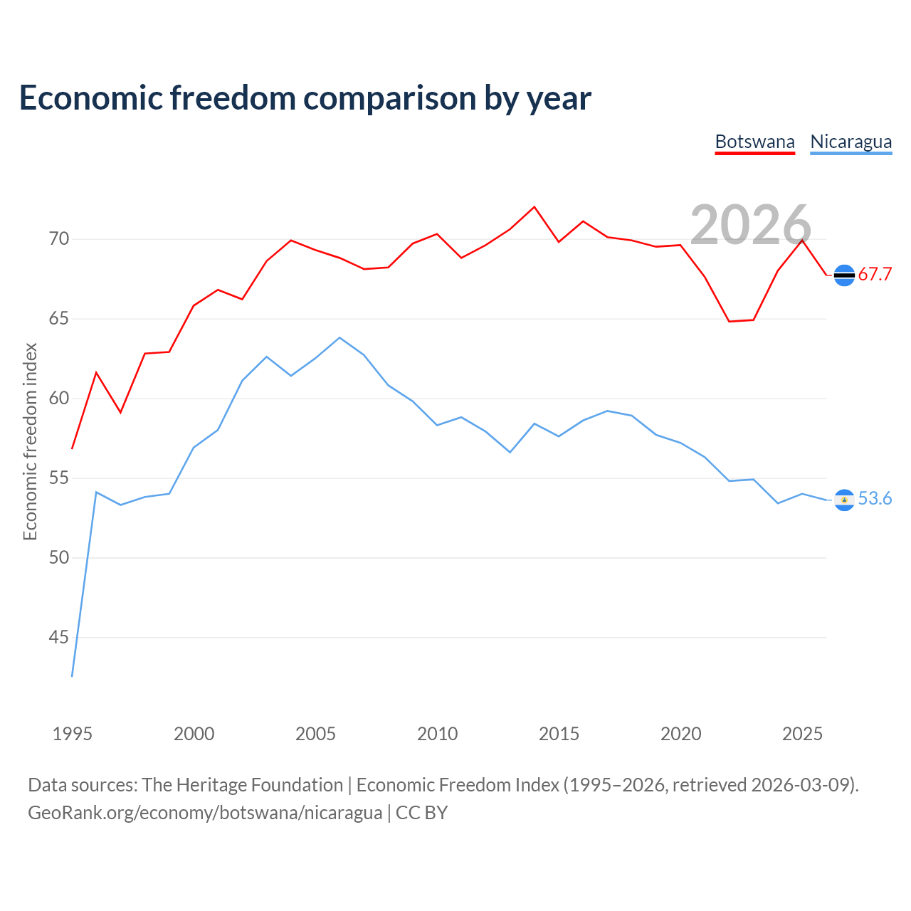 The Economic Freedom Index for Botswana is 67.7, ranking 53/197, compared to 53.6 for Nicaragua, ranking 139/197. The chart above displays a comparison of annual changes in economic freedom indexes.
