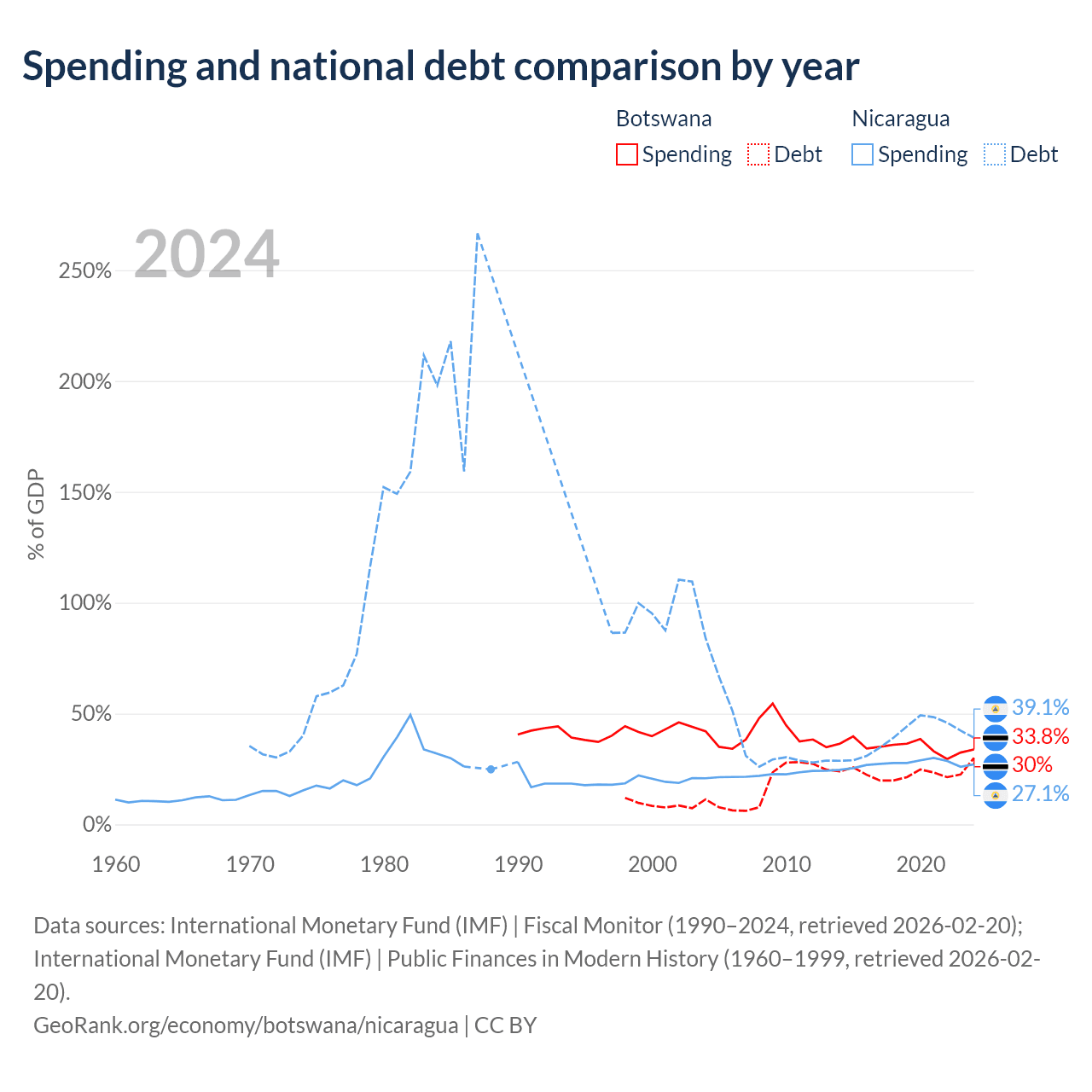 Botswana has $5.82B in government debt (30% of GDP), compared to $7.71B (39.1% of GDP) in Nicaragua.