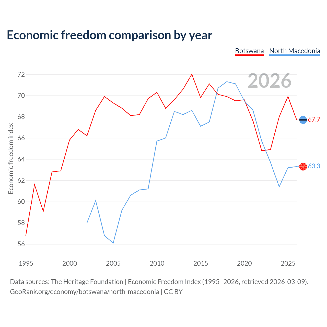 The Economic Freedom Index for Botswana is 67.7, ranking 53/197, compared to 63.3 for North Macedonia, ranking 81/197. The chart above displays a comparison of annual changes in economic freedom indexes.