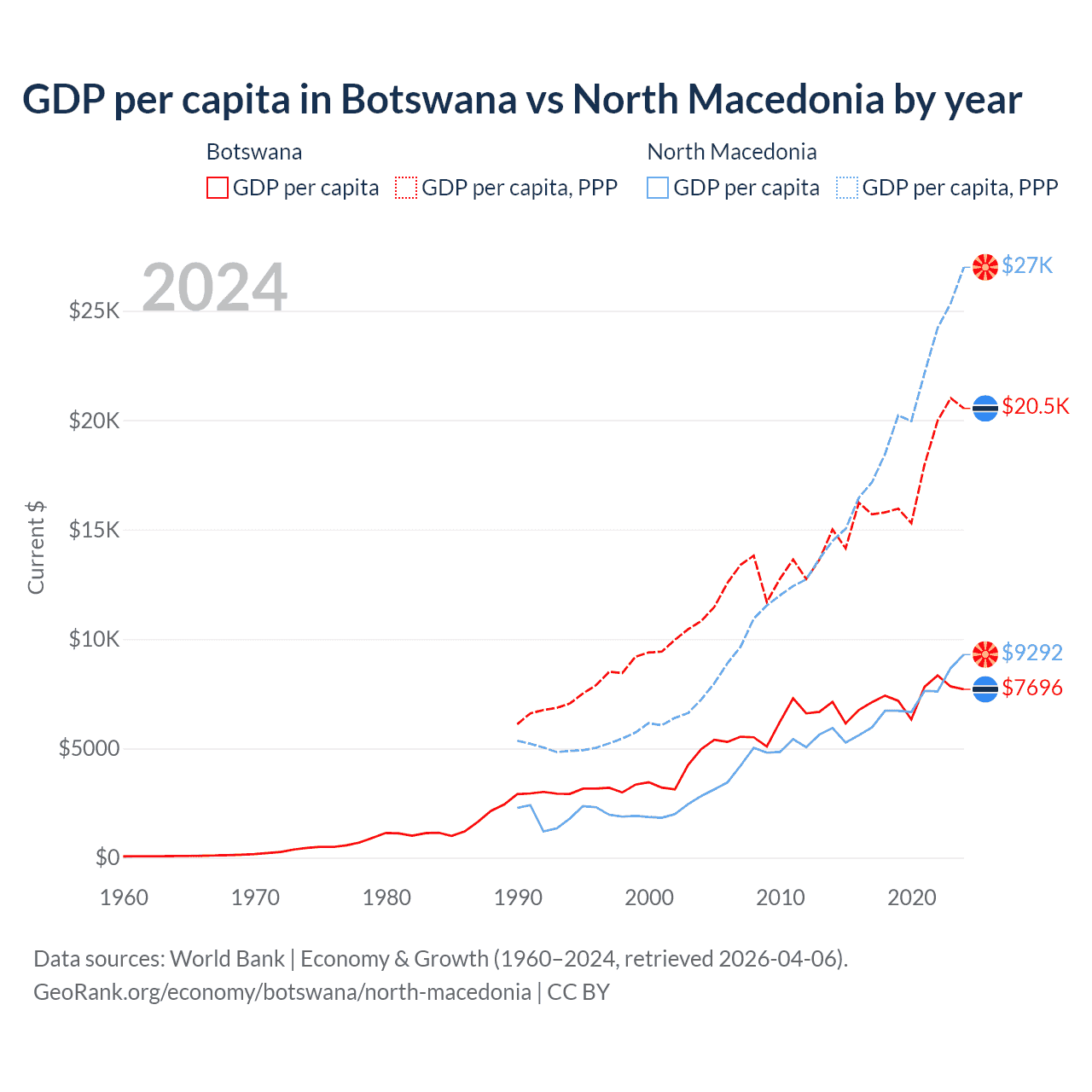 GDP per capita in Botswana vs North Macedonia by year