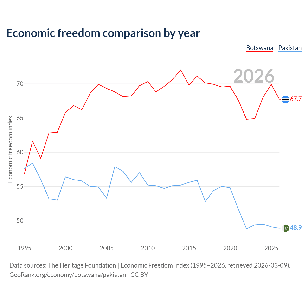 The Economic Freedom Index for Botswana is 67.7, ranking 53/197, compared to 48.9 for Pakistan, ranking 168/197. The chart above displays a comparison of annual changes in economic freedom indexes.