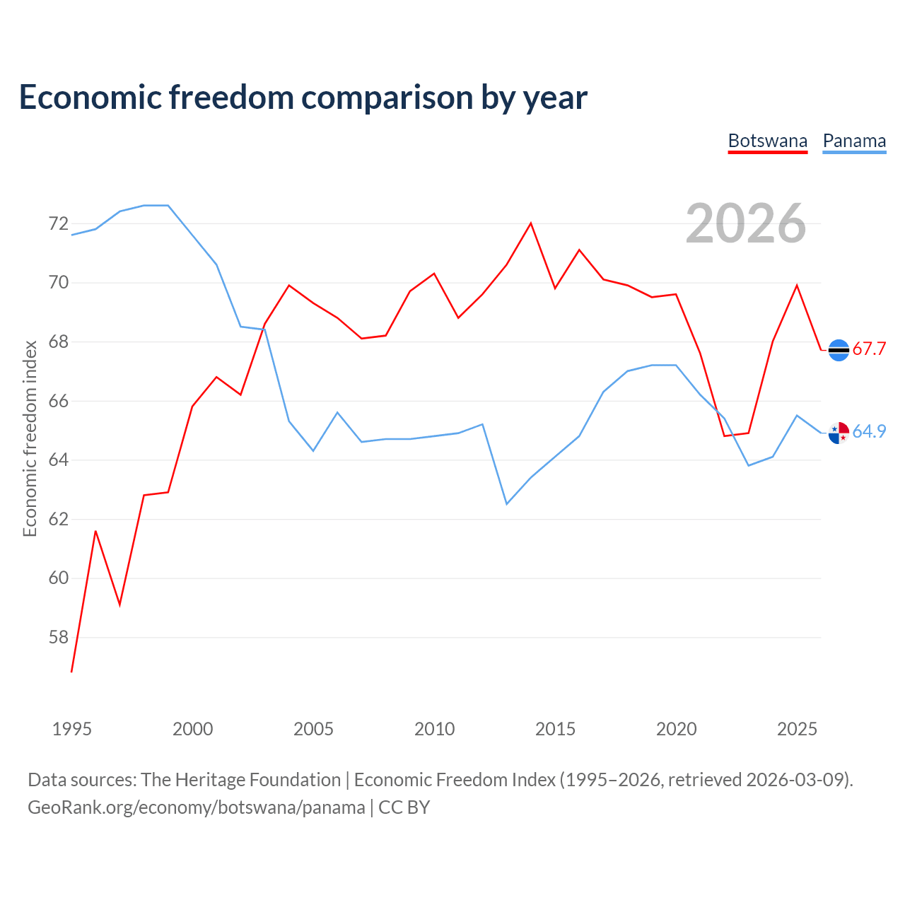 The Economic Freedom Index for Botswana is 67.7, ranking 53/197, compared to 64.9 for Panama, ranking 70/197. The chart above displays a comparison of annual changes in economic freedom indexes.
