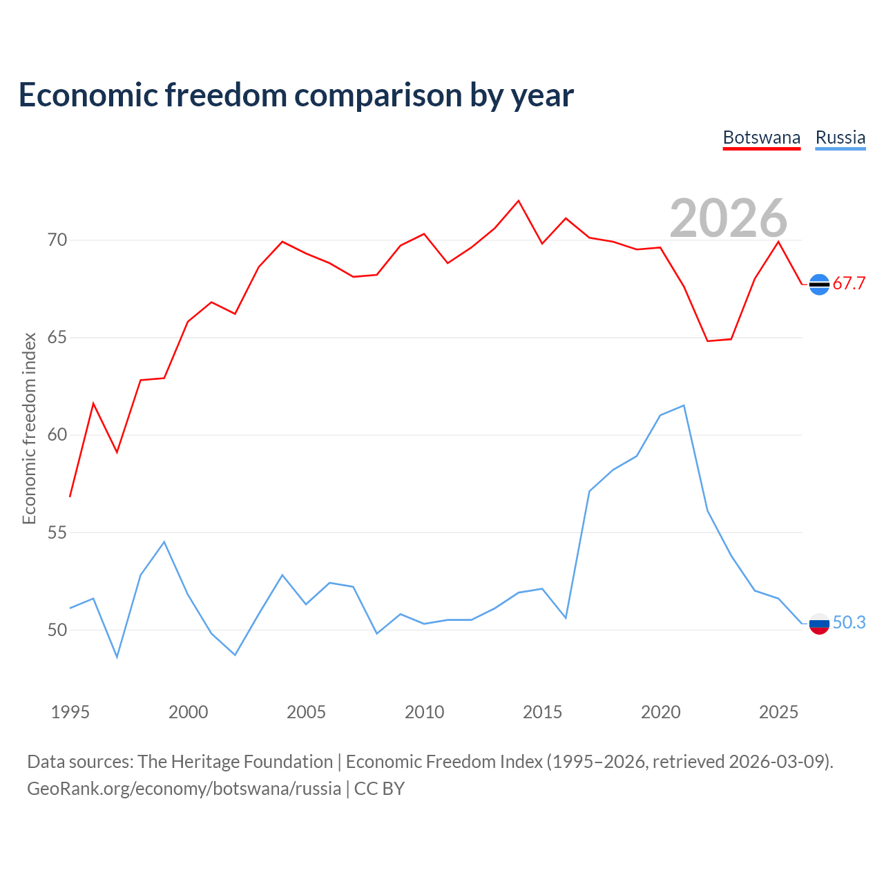 The Economic Freedom Index for Botswana is 67.7, ranking 53/197, compared to 50.3 for Russia, ranking 161/197. The chart above displays a comparison of annual changes in economic freedom indexes.