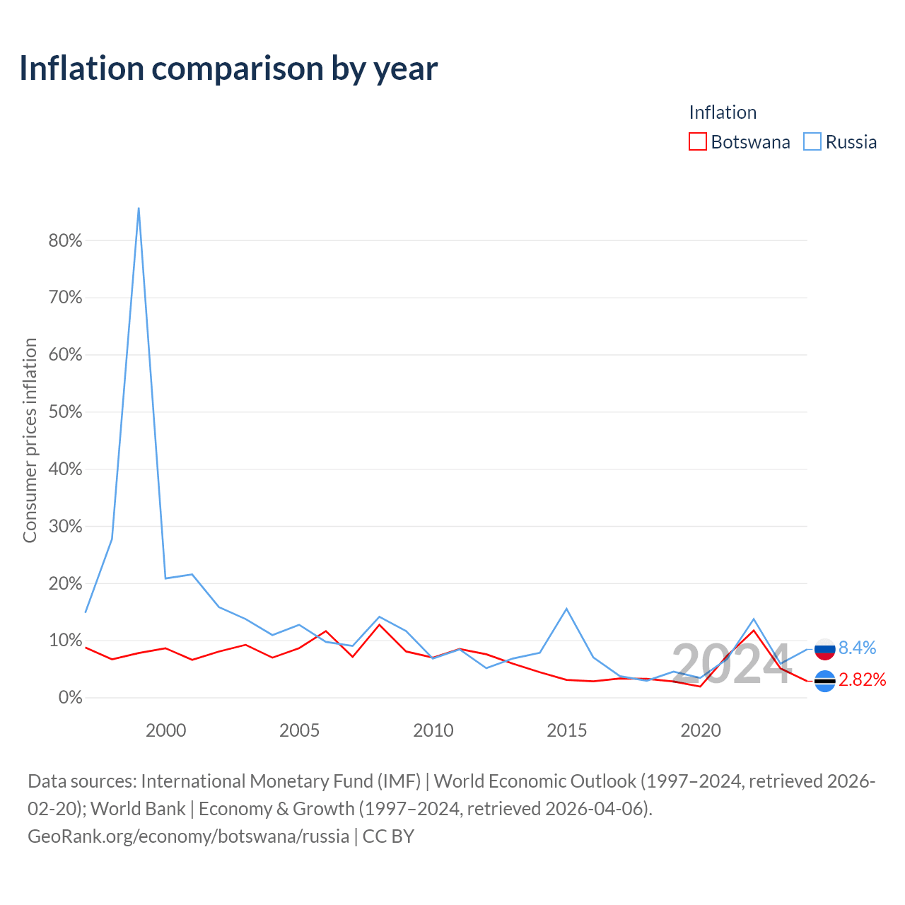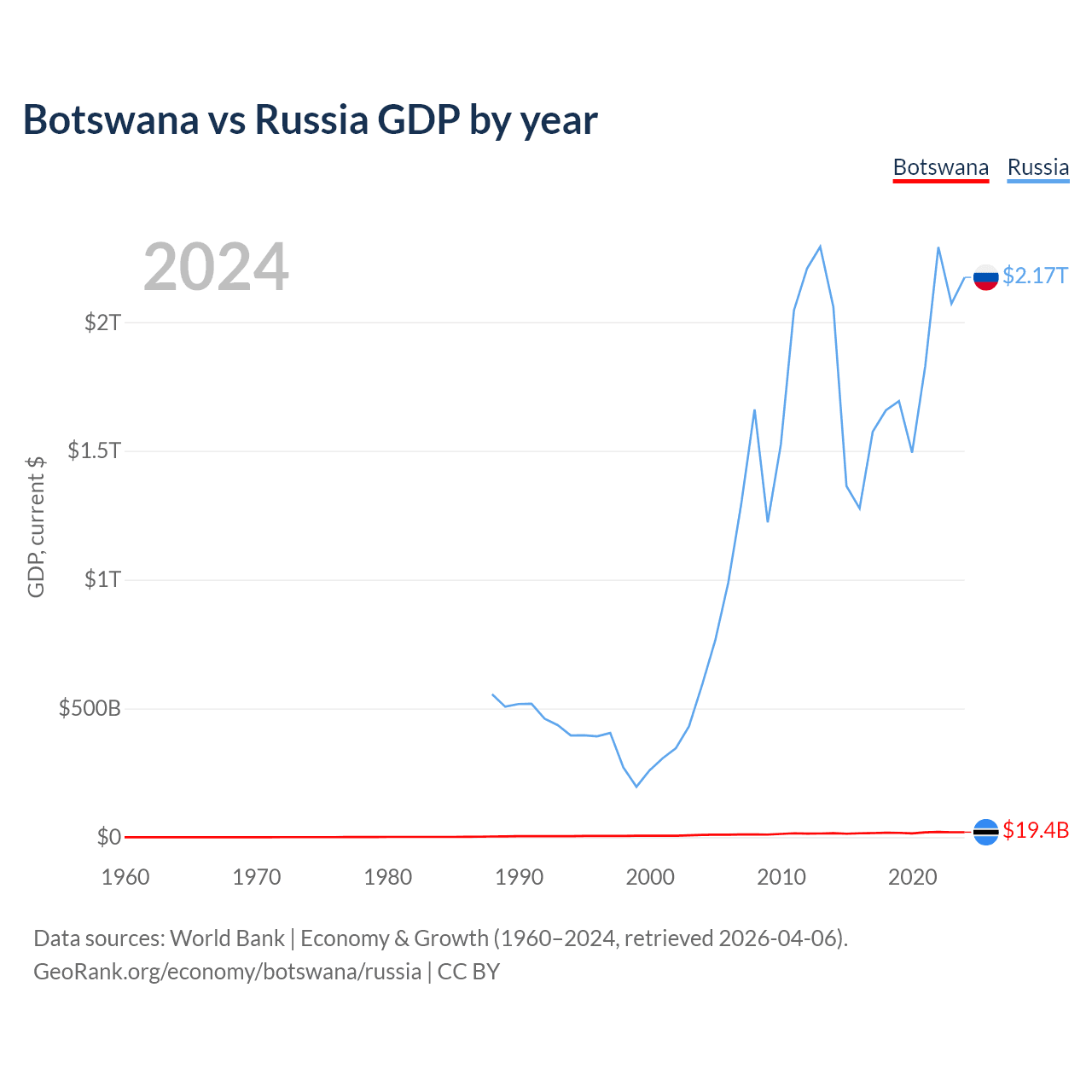 Botswana has a GDP of $19.4B compared to $2.17T for Russia, ranking 133/197 and 11/197 by economy size, respectively.