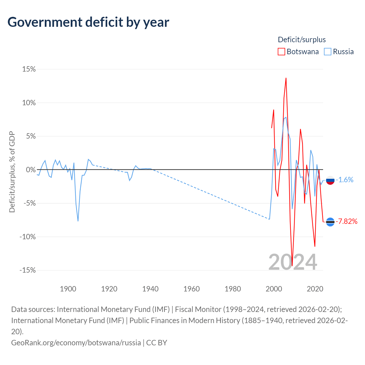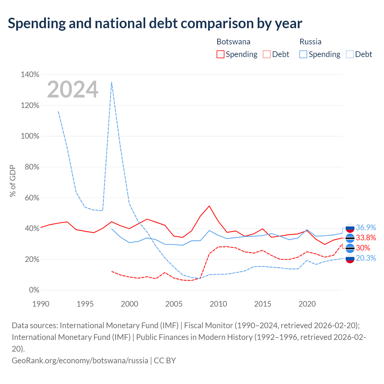 Botswana has $5.82B in government debt (30% of GDP), compared to $440B (20.3% of GDP) in Russia.