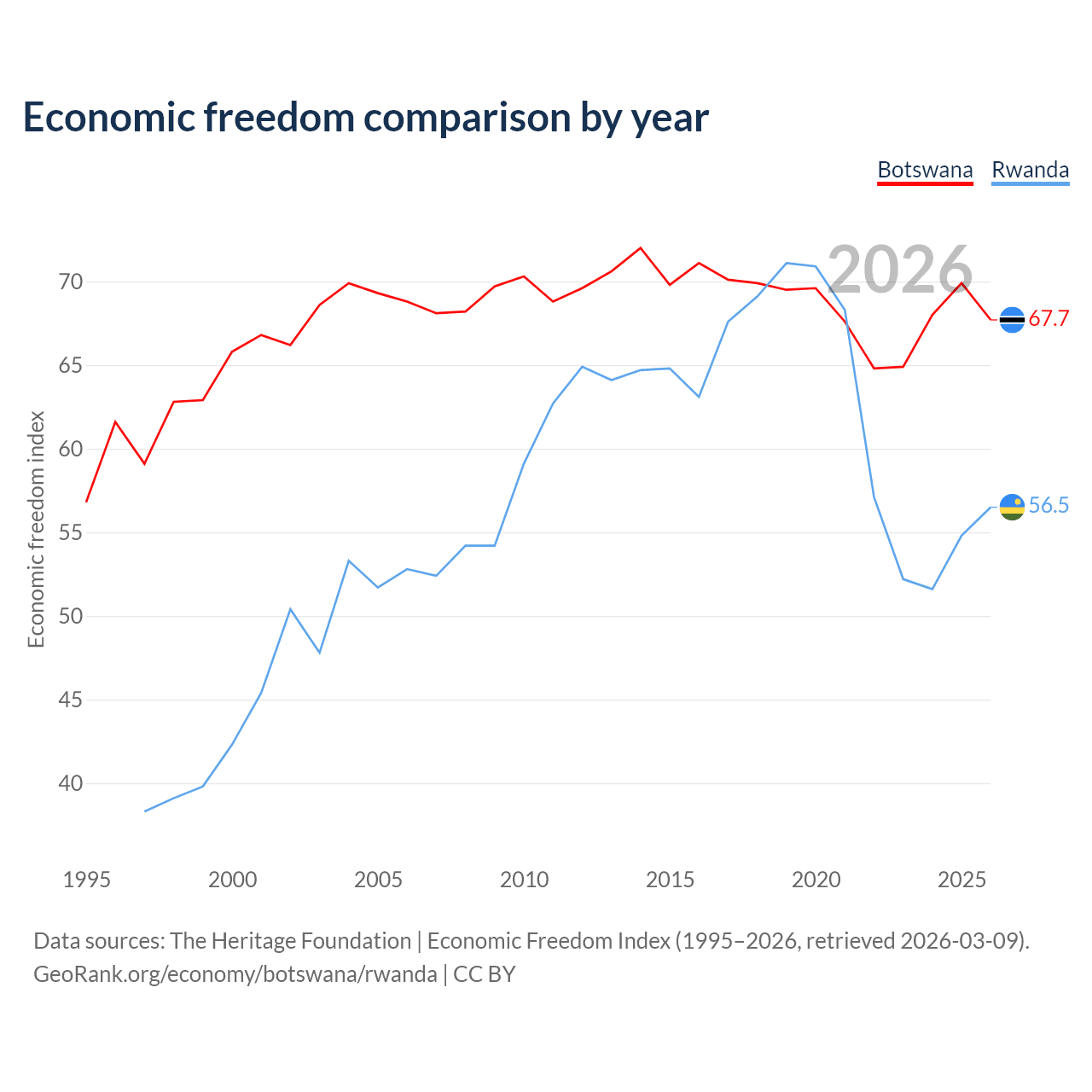 The Economic Freedom Index for Botswana is 67.7, ranking 53/197, compared to 56.5 for Rwanda, ranking 121/197. The chart above displays a comparison of annual changes in economic freedom indexes.