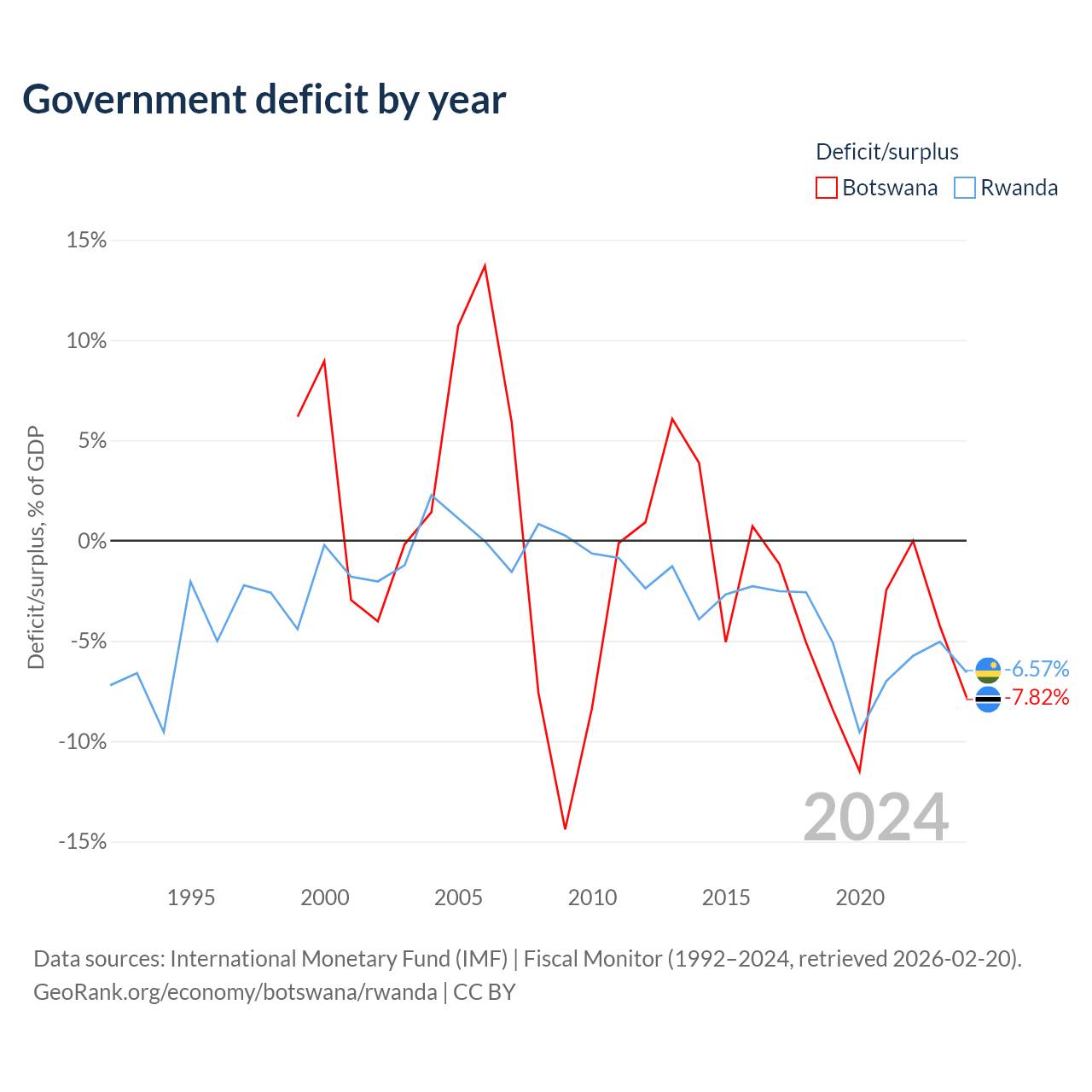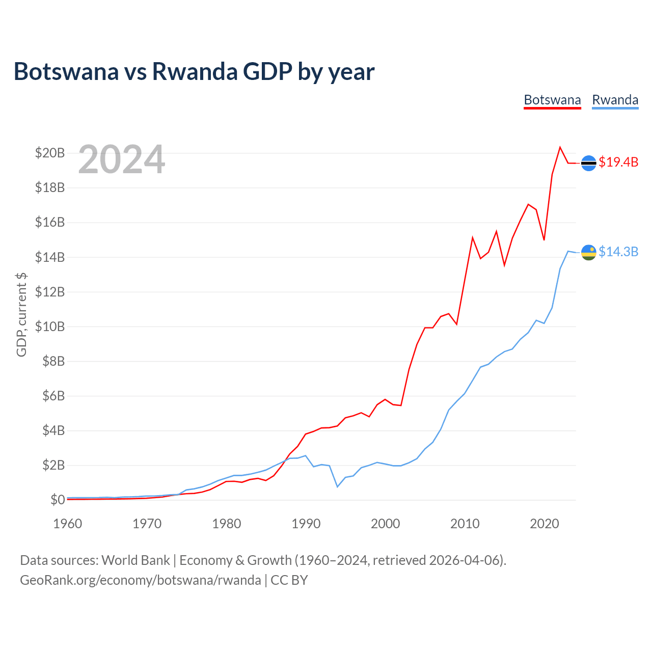 Botswana has a GDP of $19.4B compared to $14.3B for Rwanda, ranking 133/197 and 144/197 by economy size, respectively.