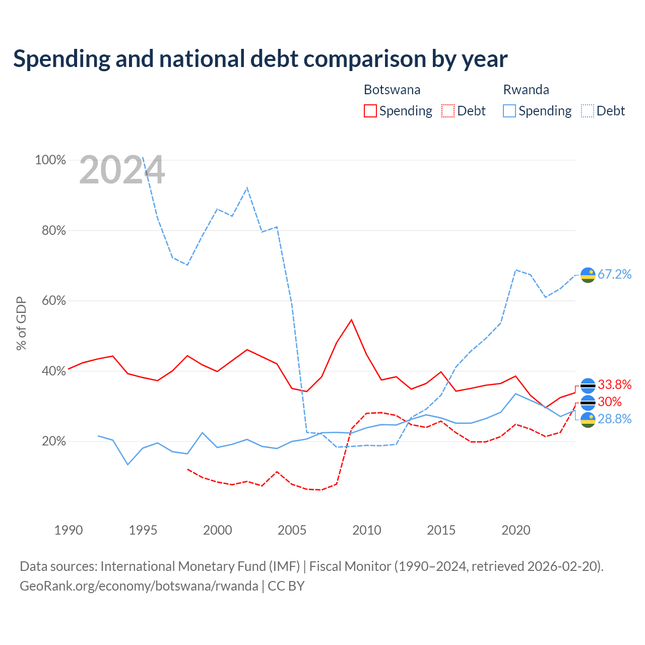 Botswana has $5.82B in government debt (30% of GDP), compared to $9.58B (67.2% of GDP) in Rwanda.