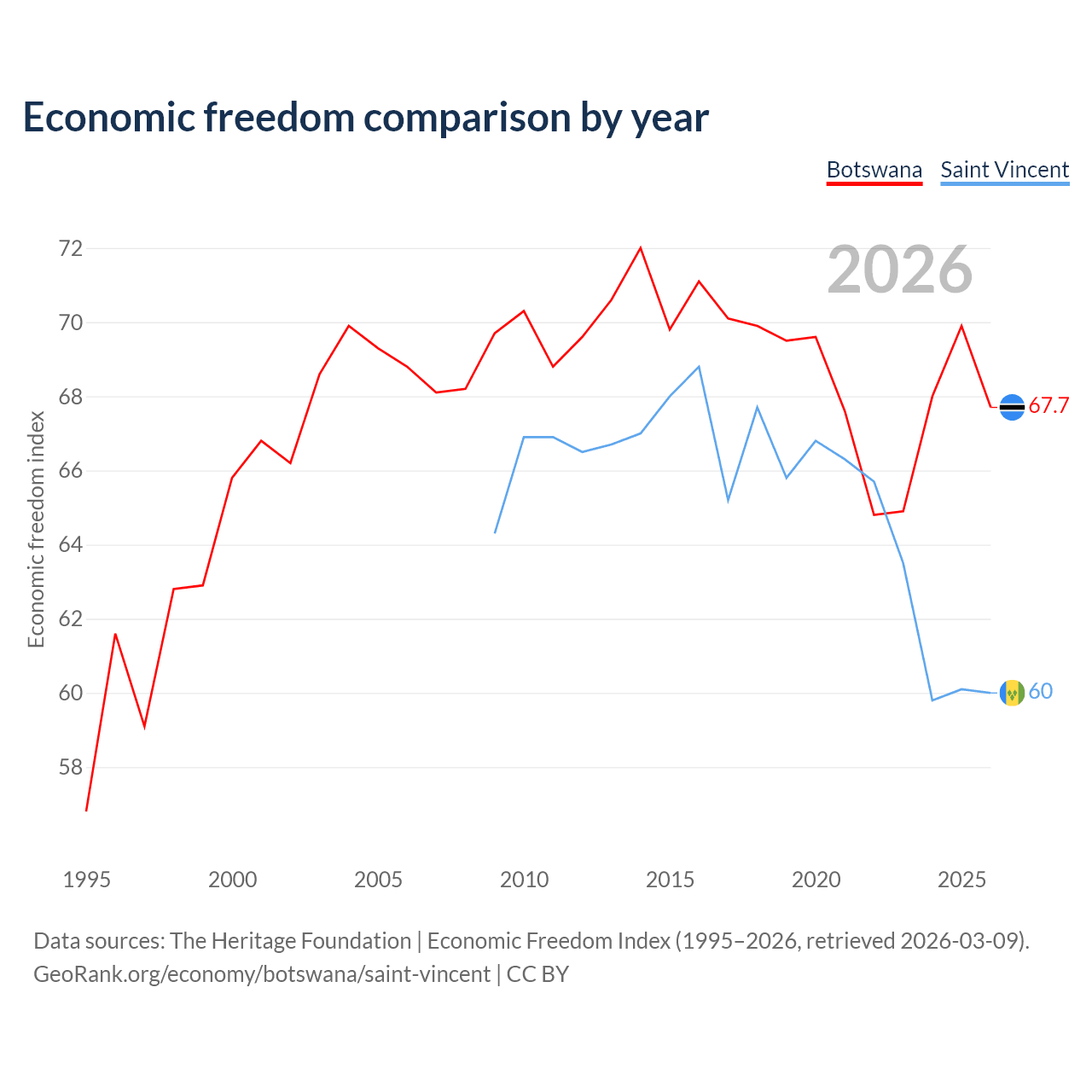 The Economic Freedom Index for Botswana is 67.7, ranking 53/197, compared to 60 for Saint Vincent, ranking 98/197. The chart above displays a comparison of annual changes in economic freedom indexes.