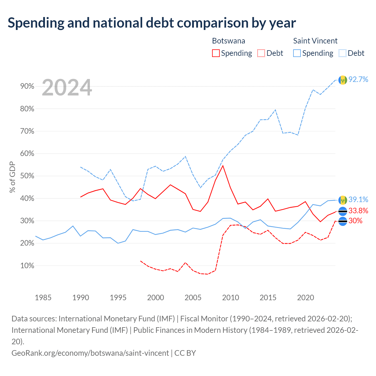 Botswana has $5.82B in government debt (30% of GDP), compared to $1.07B (92.7% of GDP) in Saint Vincent.