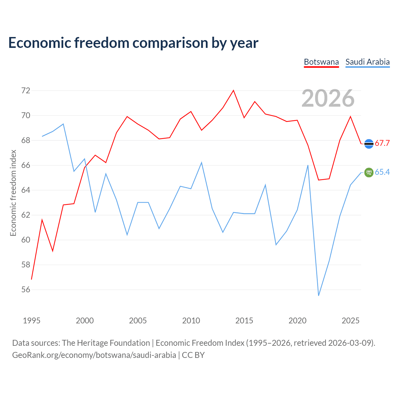 The Economic Freedom Index for Botswana is 67.7, ranking 53/197, compared to 65.4 for Saudi Arabia, ranking 65/197. The chart above displays a comparison of annual changes in economic freedom indexes.