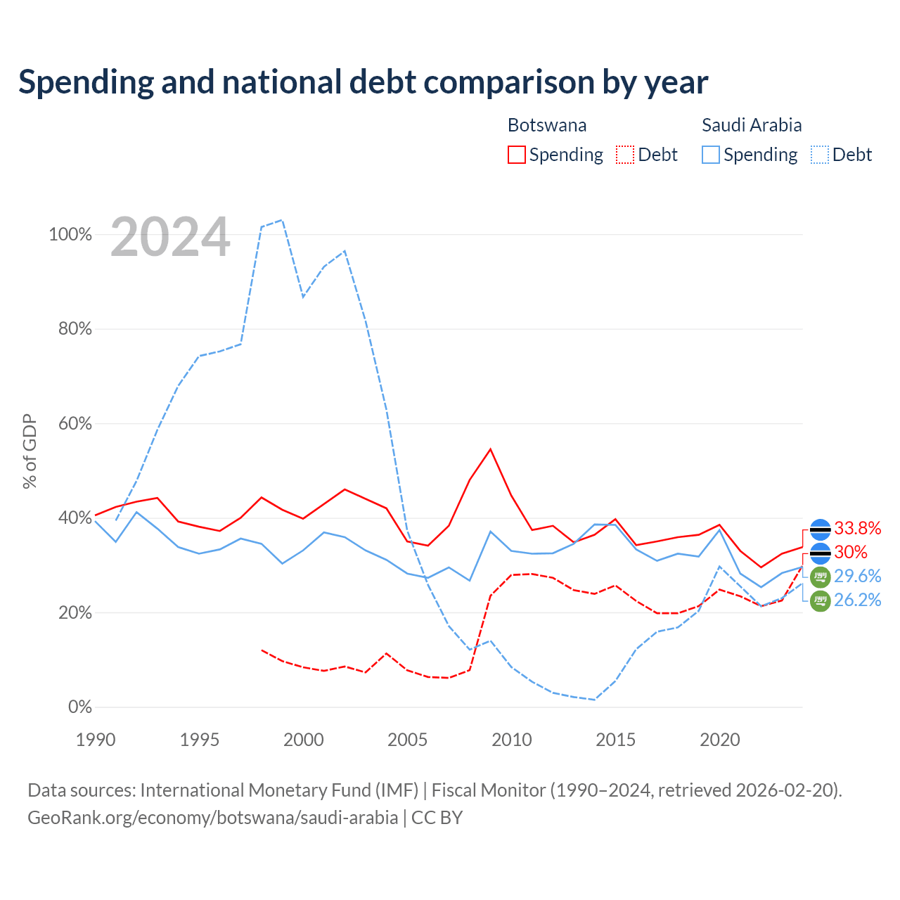 Botswana has $5.82B in government debt (30% of GDP), compared to $324B (26.2% of GDP) in Saudi Arabia.