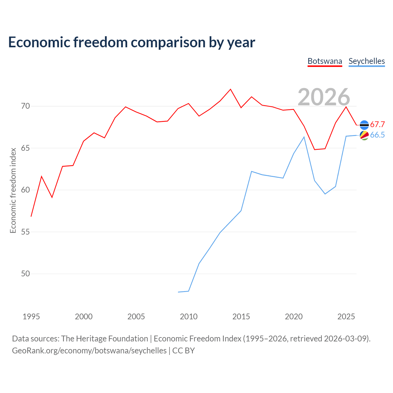 The Economic Freedom Index for Botswana is 67.7, ranking 53/197, compared to 66.5 for the Seychelles, ranking 60/197. The chart above displays a comparison of annual changes in economic freedom indexes.